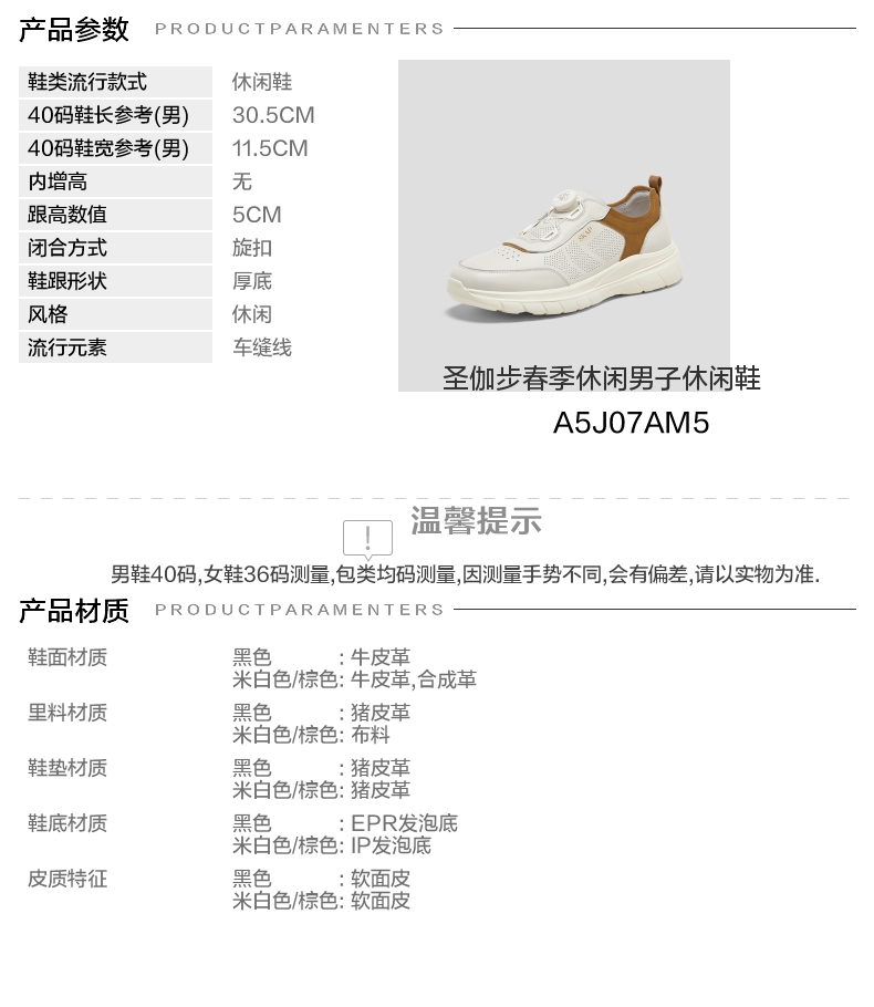 | 鞋面材质:牛皮革合成革 | 适用场合:日常休闲 | 闭合方式:旋扣 | 所在区域:电子商务 | 40码鞋宽参考(男):11.5CM |