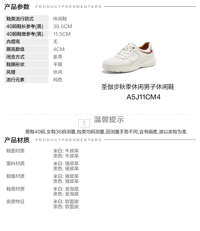 | 色系:白色 | 跟高数值:4CM | 40码鞋宽参考(男):11.5CM | 性别:男子 | 里料材质:猪皮革 |