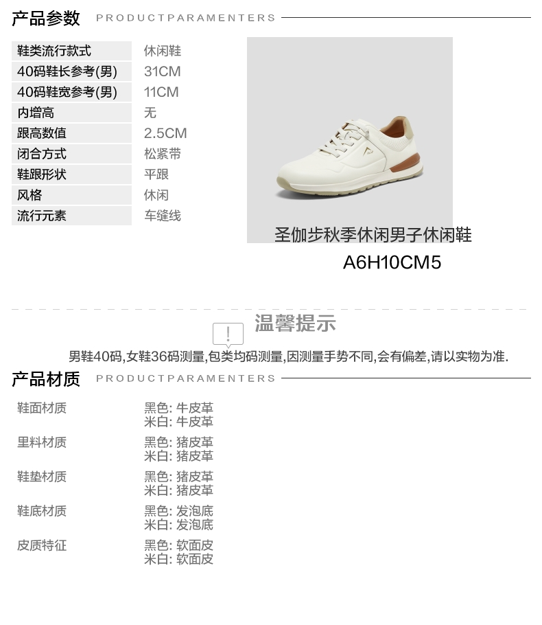 | 风格:休闲 | 色系:米色 | 跟高数值:2.5CM | 40码鞋宽参考(男):11CM | 性别:男子 |