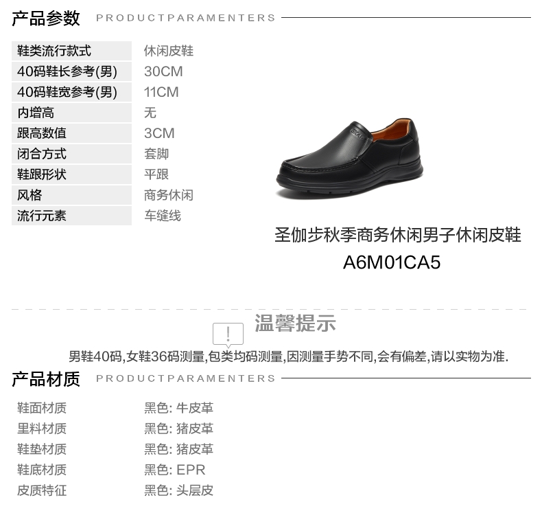| 风格:商务休闲 | 色系:黑色 | 跟高数值:3CM | 40码鞋宽参考(男):11CM | 性别:男子 |