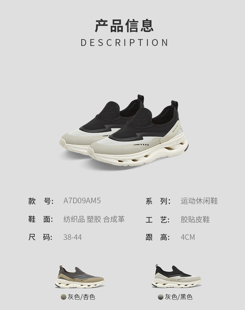 | 鞋面材质:合成革塑胶纺织品 | 适用场合:运动休闲 | 闭合方式:套脚 | 所在区域:电子商务 | 40码鞋宽参考(男):12CM |