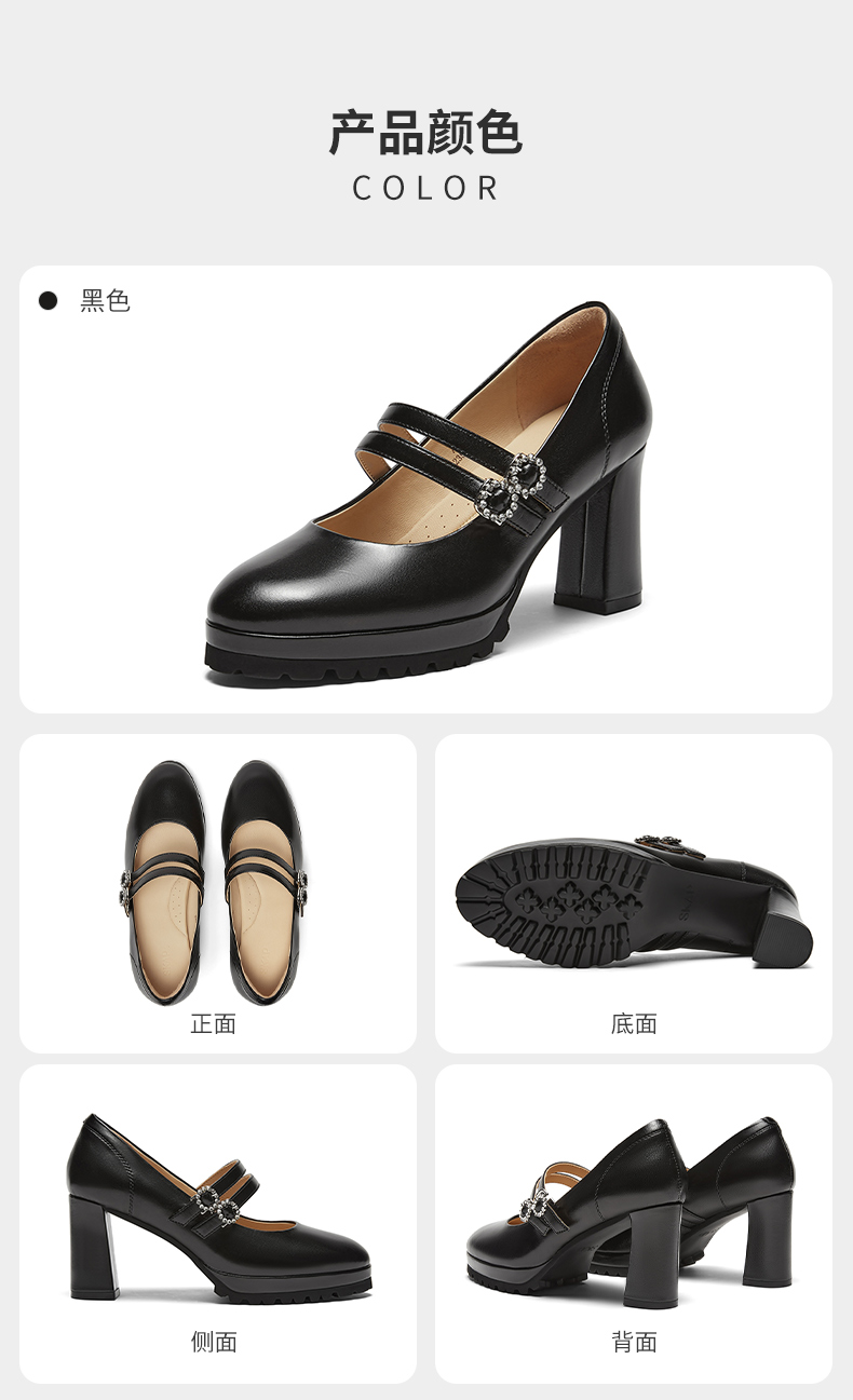 | 鞋头款式:圆头 | 鞋底材质:橡胶发泡底 | 鞋面图案:纯色 | 内增高:无 | 鞋跟形状:粗跟 |