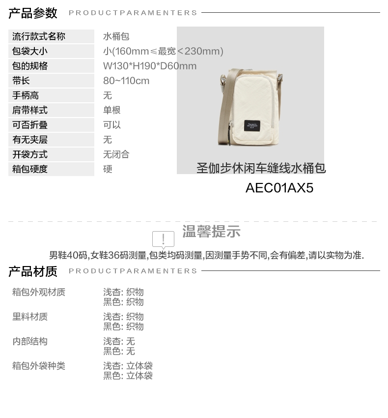 | 包的规格:W130*H190*D60mm | 内部结构:无 | 背带方式:单肩/斜挎 | 有无夹层:无 | 风格:休闲 |