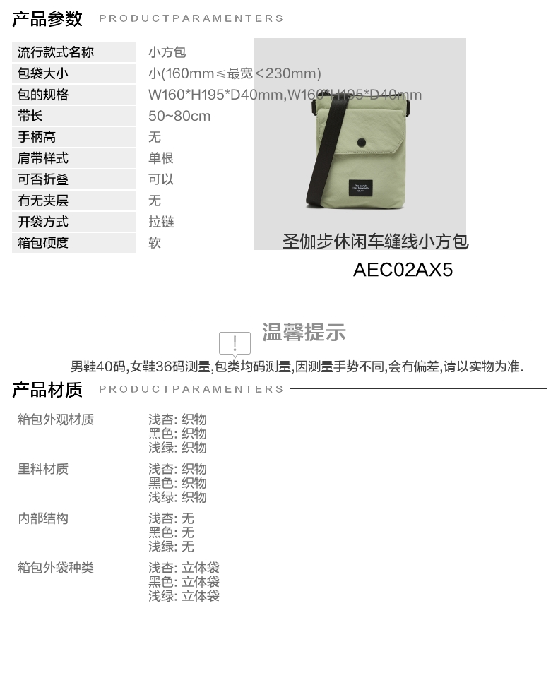 | 年份:2025年 | 色系:绿色 | 适用场景:休闲 | 流行款式名称:小方包 | 开袋方式:拉链 |
