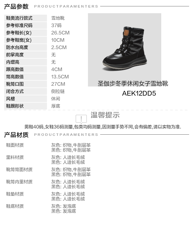| 筒高数值:13.5CM | 性别:女子 | 靴筒筒面材质:牛剖层革织物 | 里料材质:人造长毛绒 | 制鞋工艺:胶贴皮鞋 |