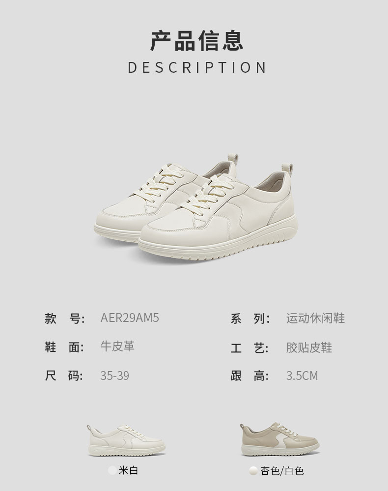 | 色系:米白 | 跟高数值:3.5CM | 性别:女子 | 里料材质:猪皮革 | 制鞋工艺:胶贴皮鞋 |