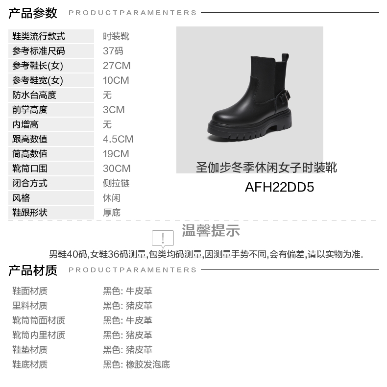 | 筒高数值:19CM | 性别:女子 | 靴筒筒面材质:牛皮革 | 里料材质:猪皮革 | 制鞋工艺:胶贴皮鞋 |