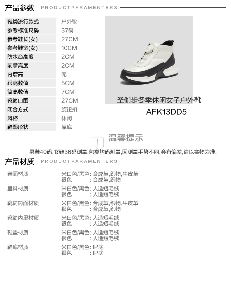 | 鞋底材质:IP底 | 靴筒内里材质:人造短毛绒 | 内增高:无 | 鞋面材质:牛皮革织物合成革 | 闭合方式:旋钮扣 |