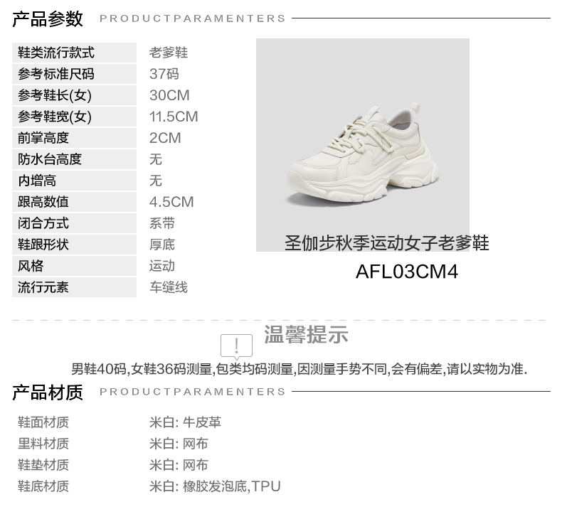 | 鞋跟形状:厚底 | 参考鞋长(女):30CM | 流行元素:车缝线 | 参考鞋宽(女):11.5CM | 风格:运动 |
