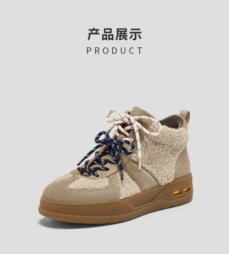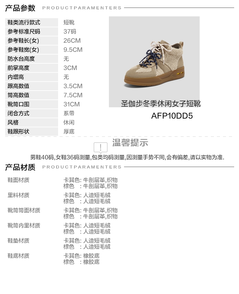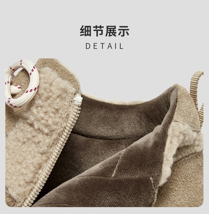 | 参考鞋宽(女):9.5CM | 风格:休闲 | 鞋面内里材质:人造短毛绒 | 色系:卡其 | 跟高数值:3.5CM |