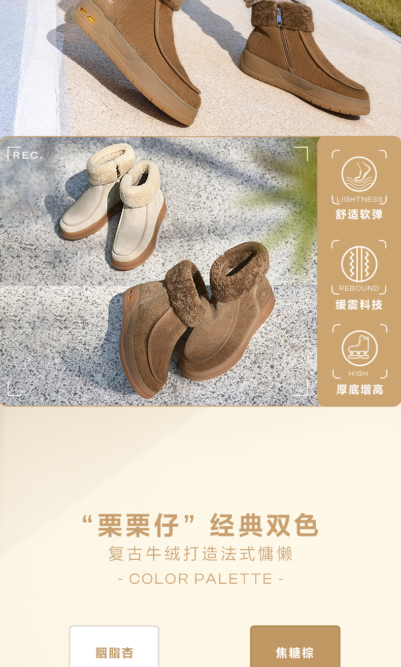 | 参考鞋宽(女):9.5CM | 风格:休闲 | 鞋面内里材质:人造短毛绒 | 色系:米黄色 | 跟高数值:4CM |
