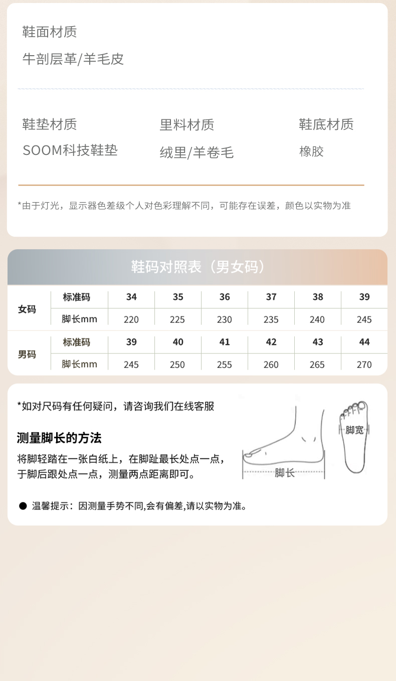 | 帮面材质:羊毛皮牛剖层革 | 配跟:无 | 靴筒口围:35CM | 上市时间:2025年冬季 | 鞋类流行款式:雪地靴 |