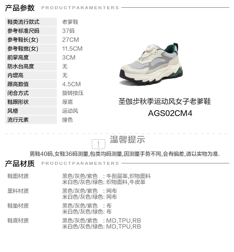 | 鞋类流行款式:老爹鞋 | 鞋头款式:圆头 | 执行标准:休闲鞋 QB/T2955-2017 | 跟高范围:中跟鞋(3-5CM) | 鞋面图案:拼色 |