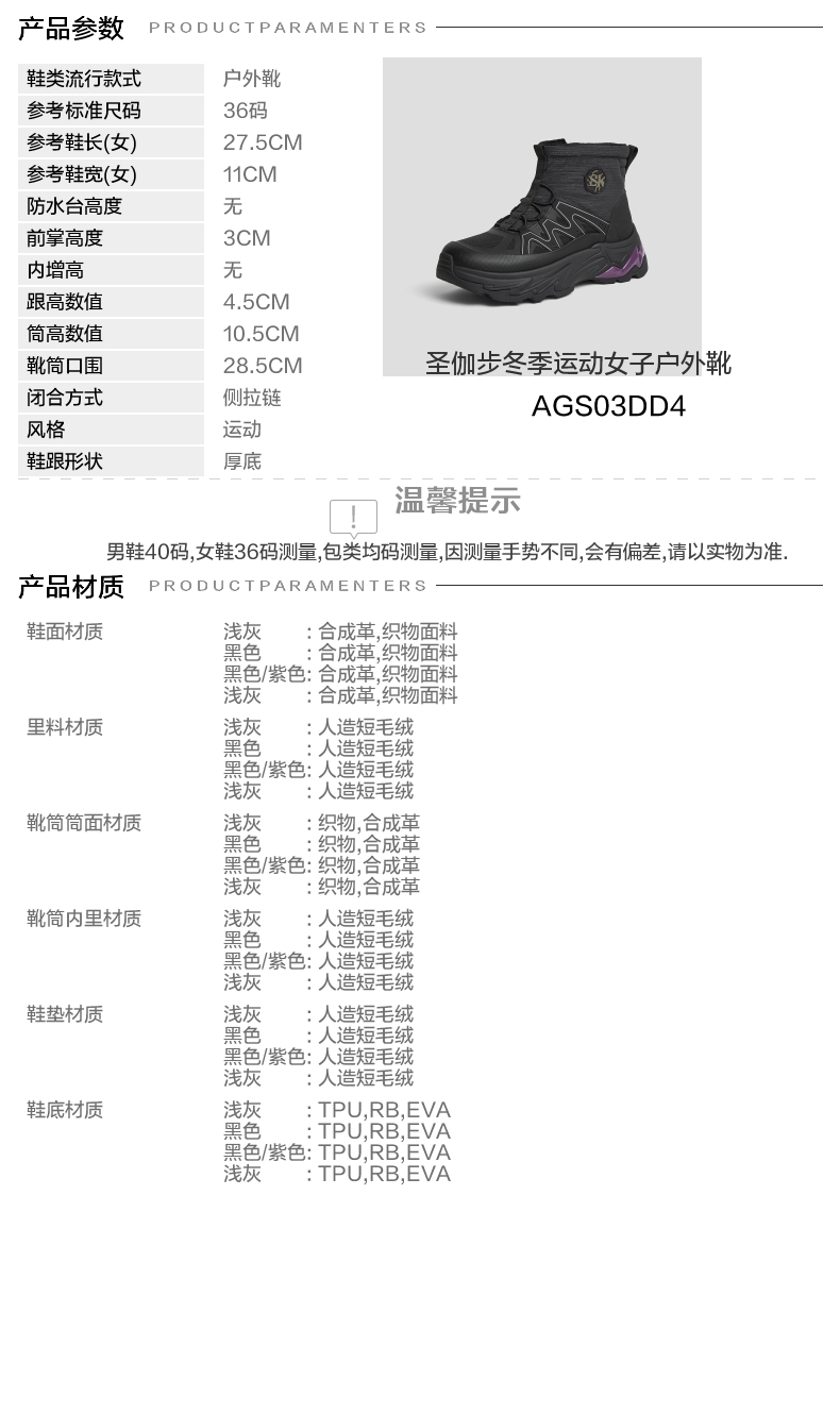 | 鞋底材质:Mold底RBTPU | 靴筒内里材质:人造短毛绒 | 内增高:无 | 鞋面材质:合成革织物 | 闭合方式:侧拉链 |