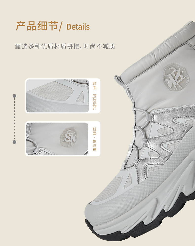 | 帮面材质:织物合成革 | 配跟:无 | 靴筒口围:28.5CM | 上市时间:2025年冬季 | 鞋类流行款式:户外靴 |