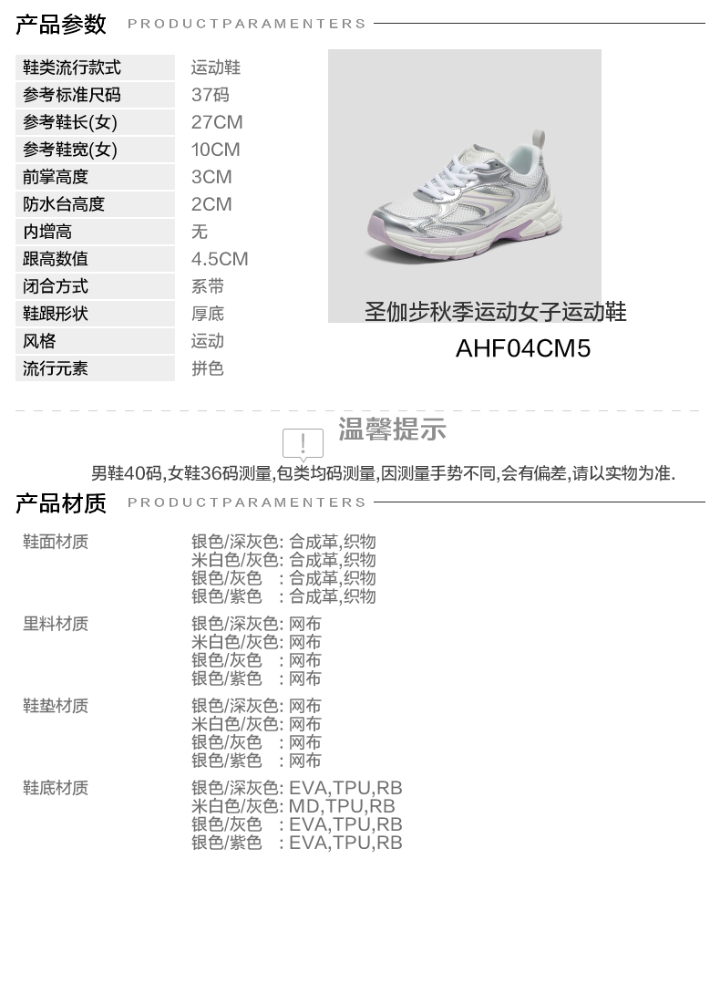 | 鞋跟形状:厚底 | 参考鞋长(女):27CM | 流行元素:拼色 | 参考鞋宽(女):10CM | 风格:运动 |