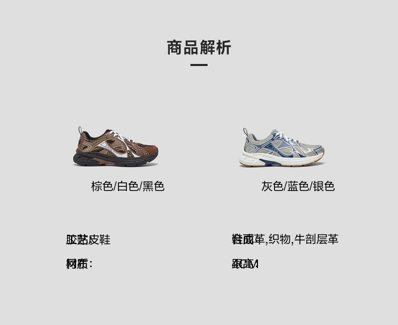 | 鞋帮:低帮 | 鞋底材质:RBTPUMD | 内增高:无 | 鞋面材质:织物合成革牛剖层革 | 闭合方式:系带 |