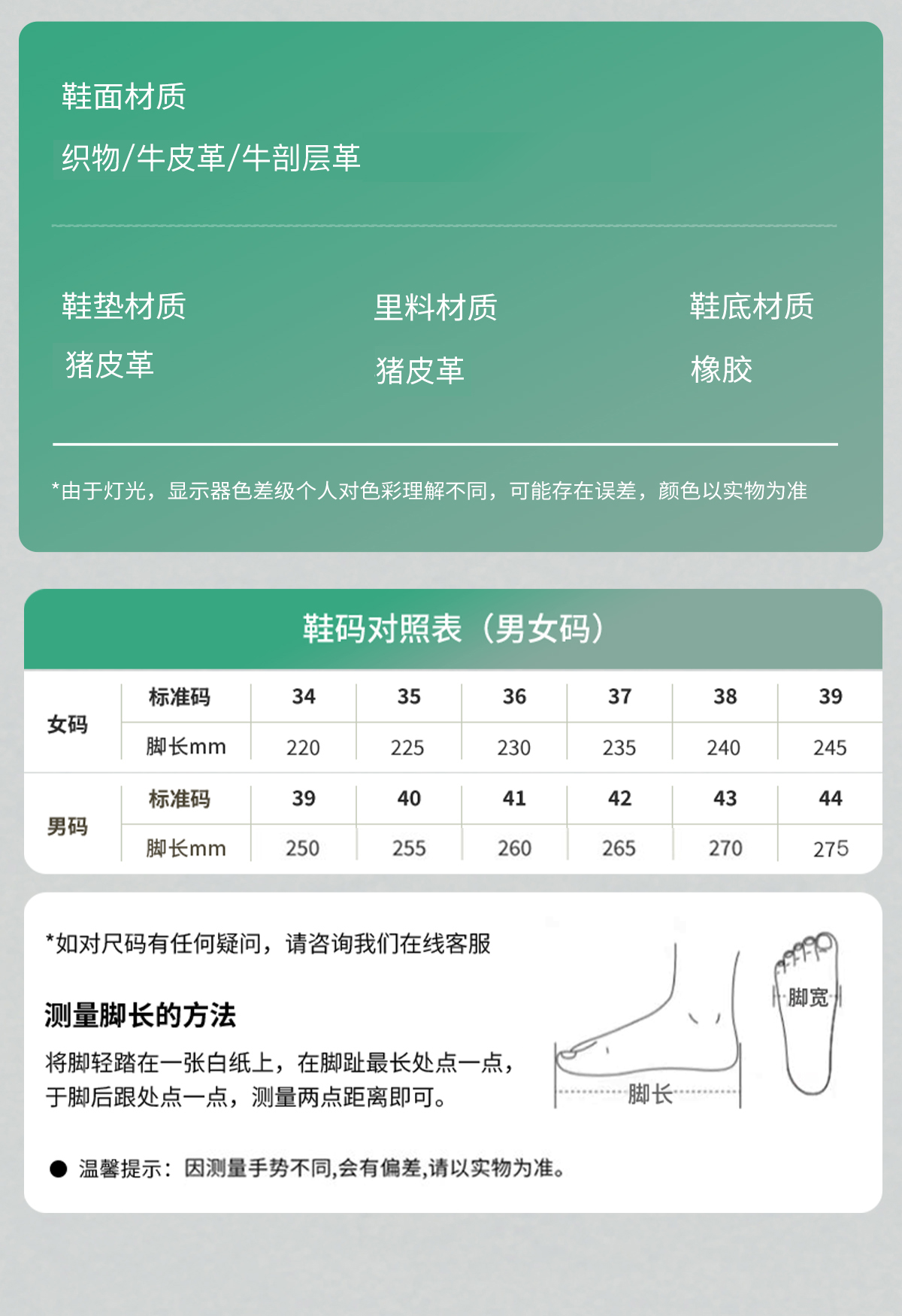 | 鞋帮:低帮 | 鞋底材质:EVA发泡底 | 内增高:无 | 鞋面材质:牛剖层革牛皮革织物面料 | 适用场合:日常休闲 |