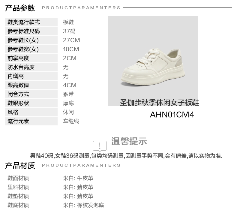 | 色系:米白 | 跟高数值:4CM | 性别:女子 | 里料材质:猪皮革 | 制鞋工艺:胶贴皮鞋 |