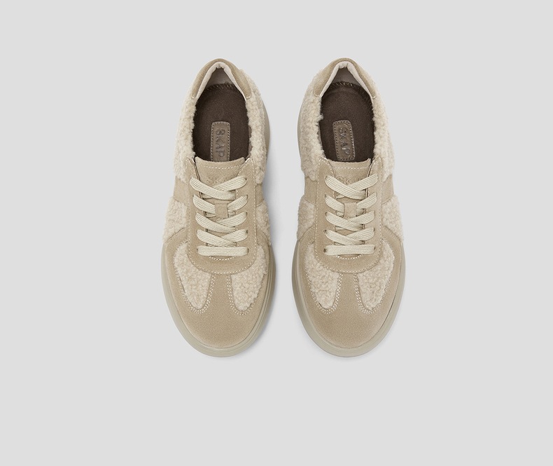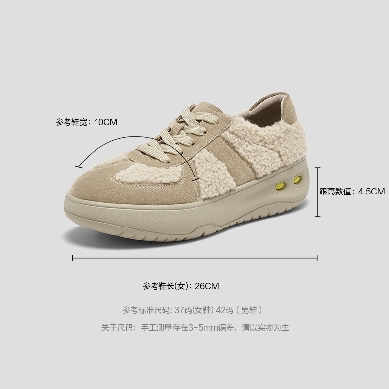 | 鞋面内里材质:人造短毛绒 | 色系:杏色 | 跟高数值:4.5CM | 适用人群:青少年 | 性别:女子 |
