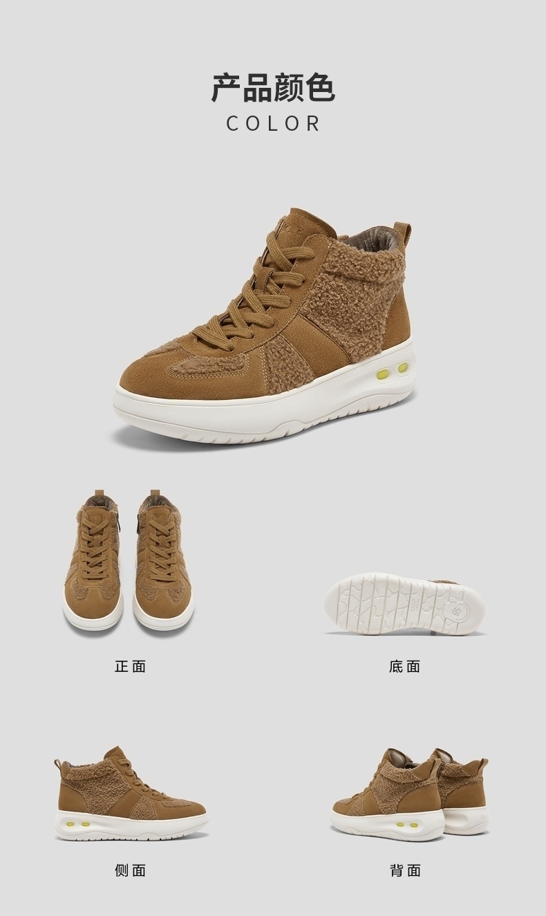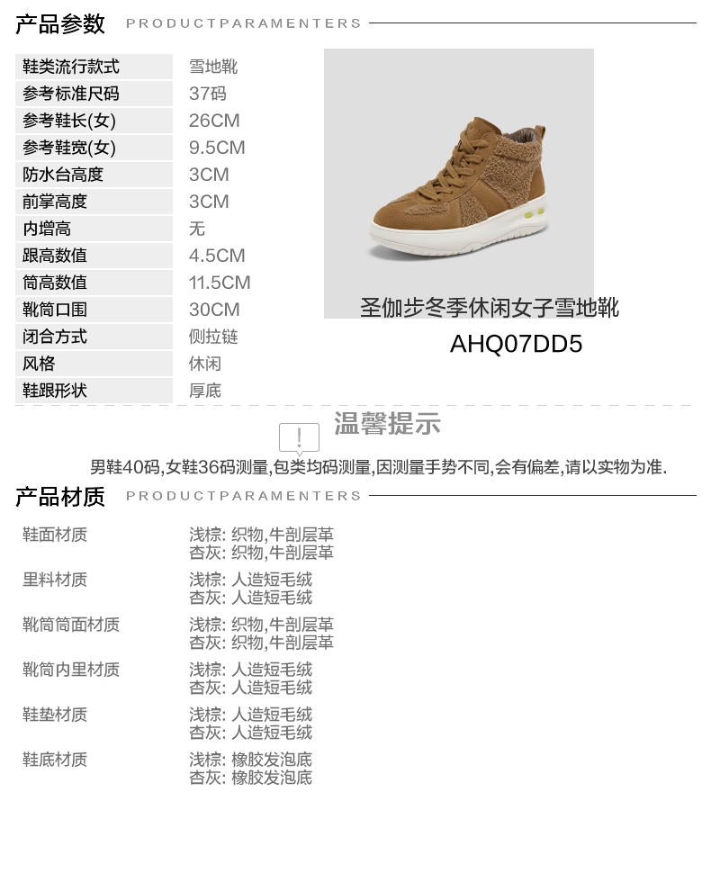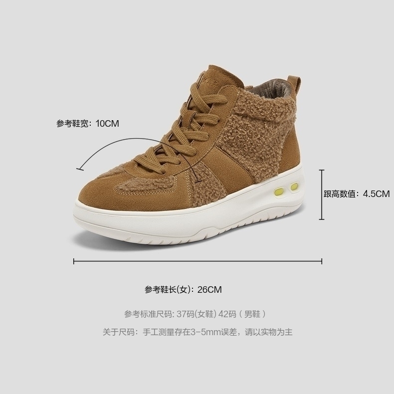 | 参考鞋宽(女):9.5CM | 风格:休闲 | 鞋面内里材质:人造短毛绒 | 色系:棕色 | 跟高数值:4.5CM |