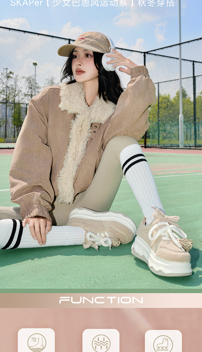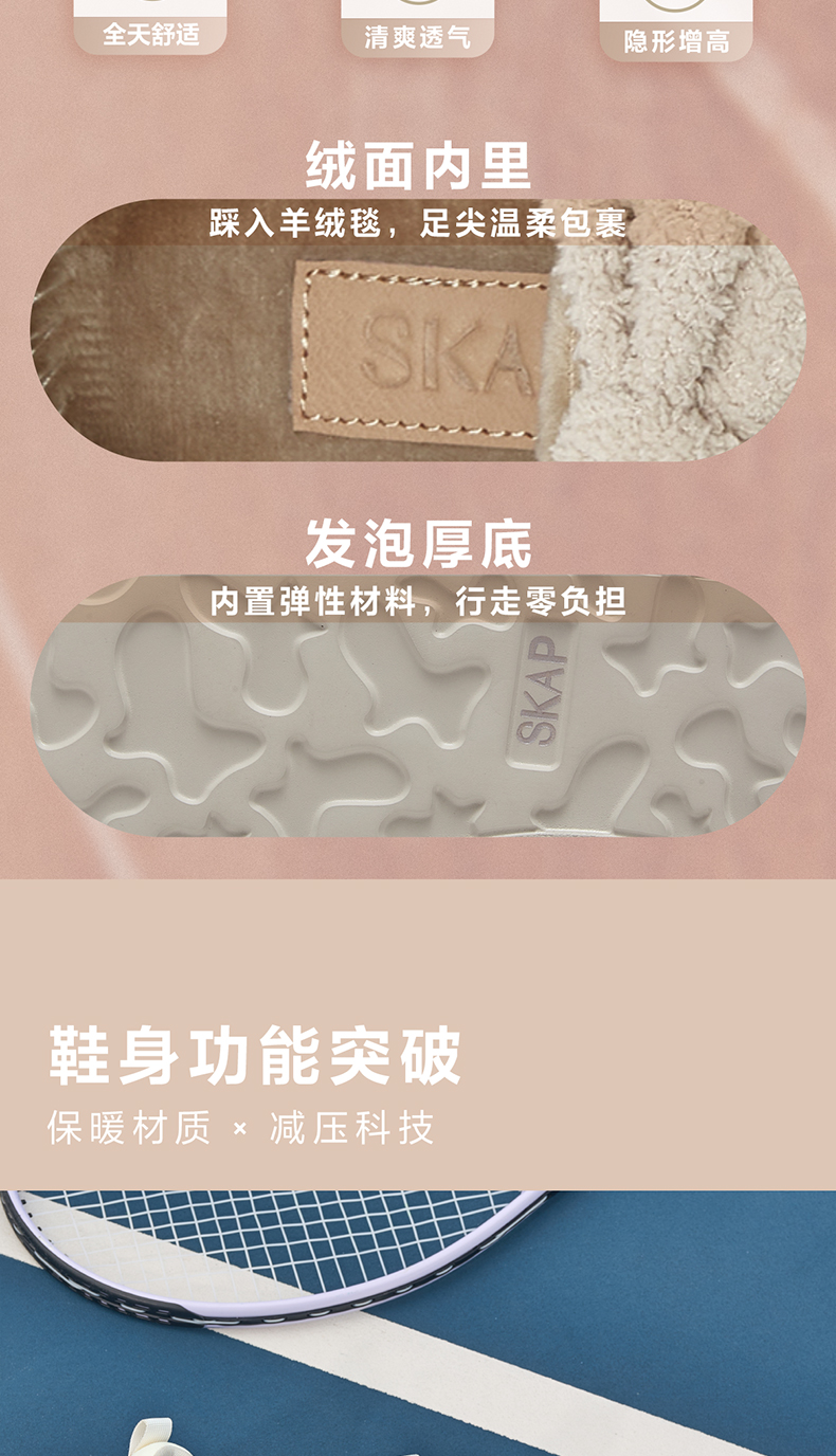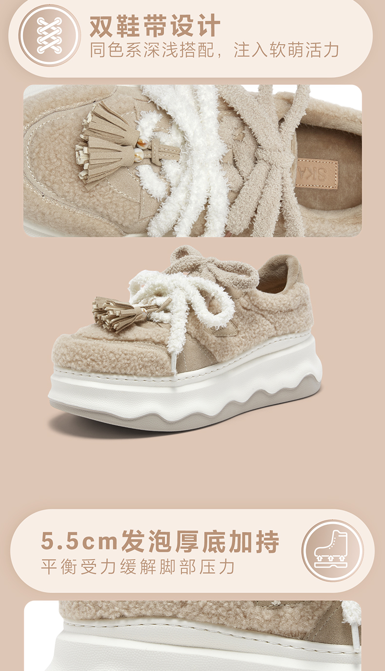 | 鞋面内里材质:人造短毛绒 | 色系:杏色 | 跟高数值:5.5CM | 适用人群:青少年 | 性别:女子 |