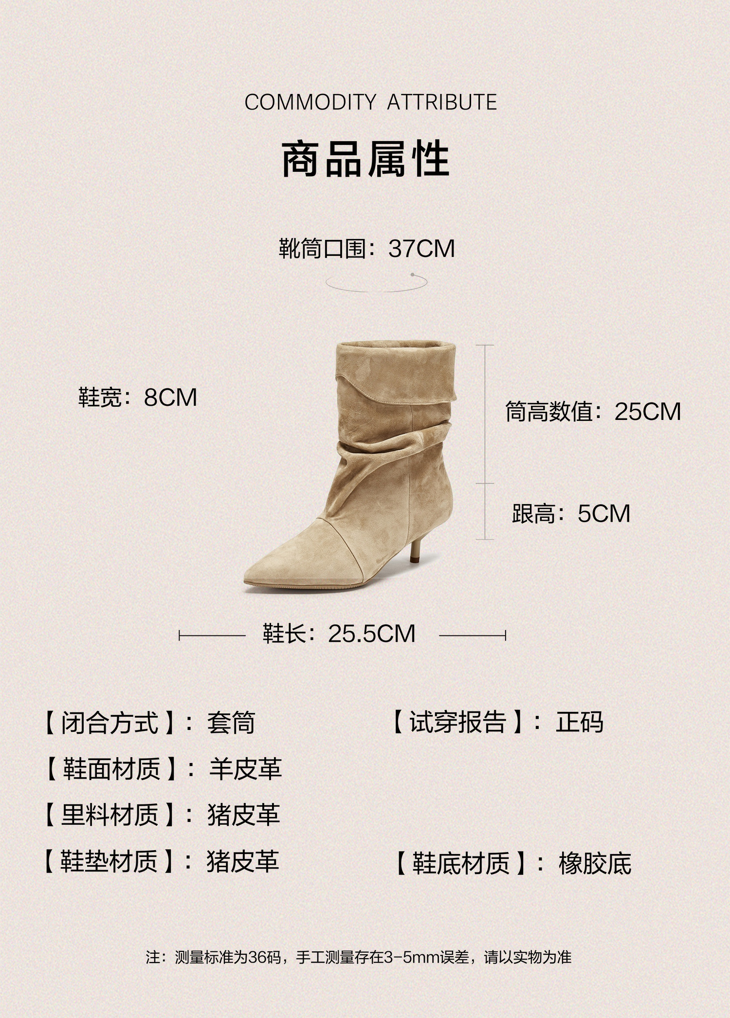 | 风格:时尚潮流 | 鞋面内里材质:猪皮革 | 色系:杏色 | 跟高数值:5CM | 筒高数值:25CM |