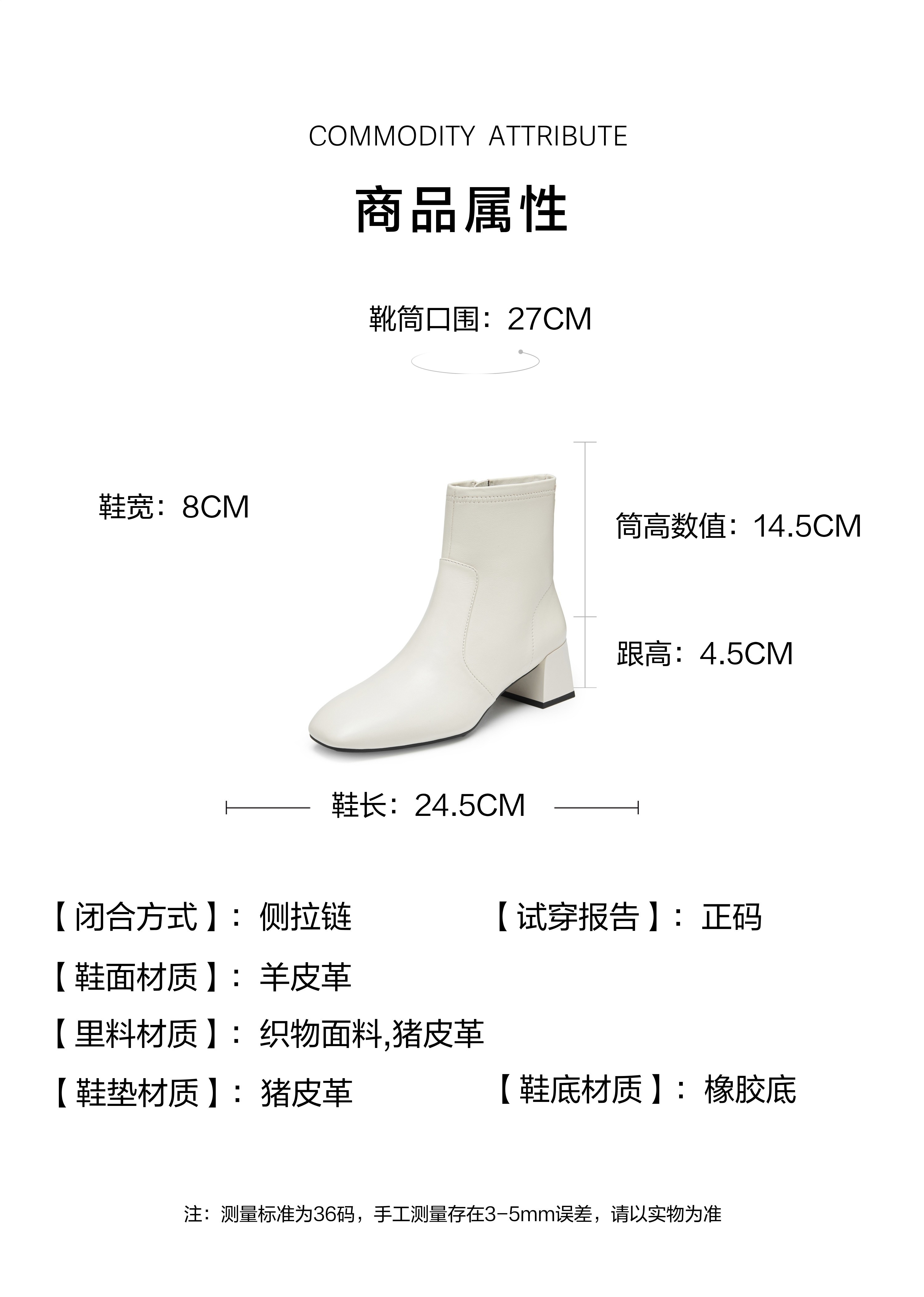 | 鞋类流行款式:时装靴 | 鞋头款式:方头 | 执行标准:皮鞋 QB/T1002-2015 | 跟高范围:中跟鞋(3-5CM) | 鞋面图案:纯色 |