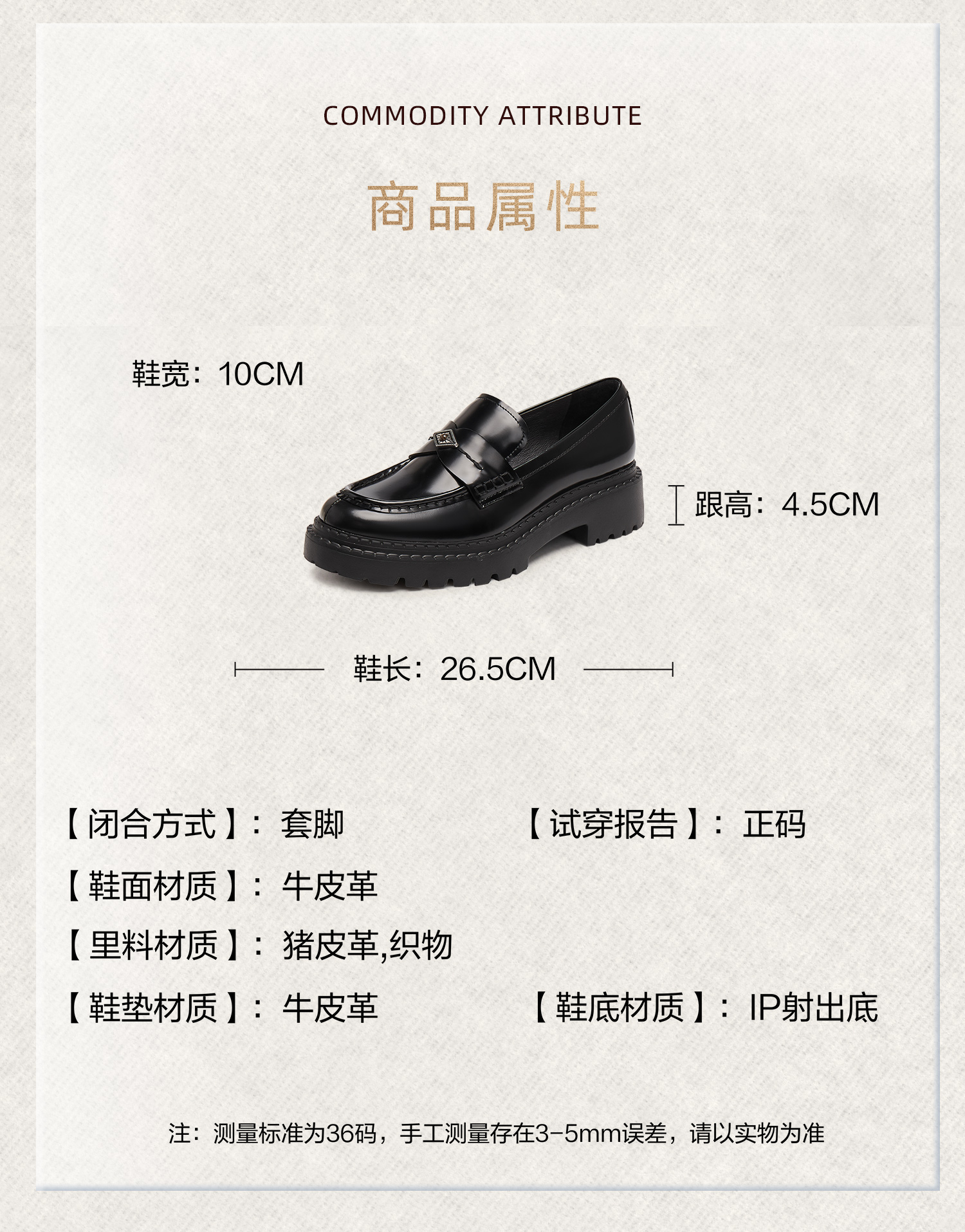 | 闭合方式:套脚 | 风格:时尚潮流 | 色系:黑色 | 跟高数值:4.5CM | 配跟:无 |