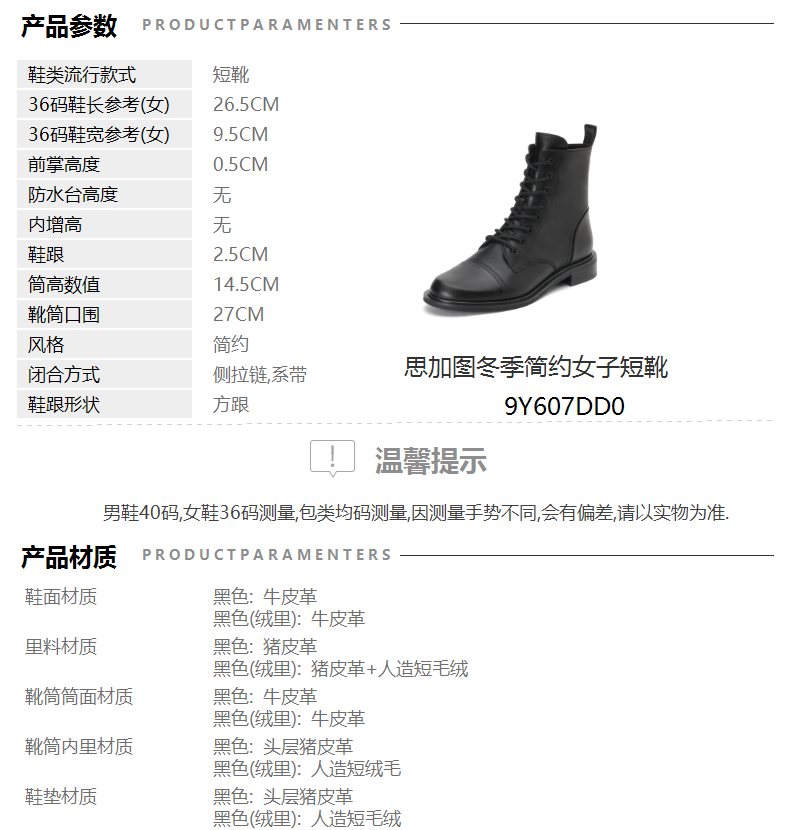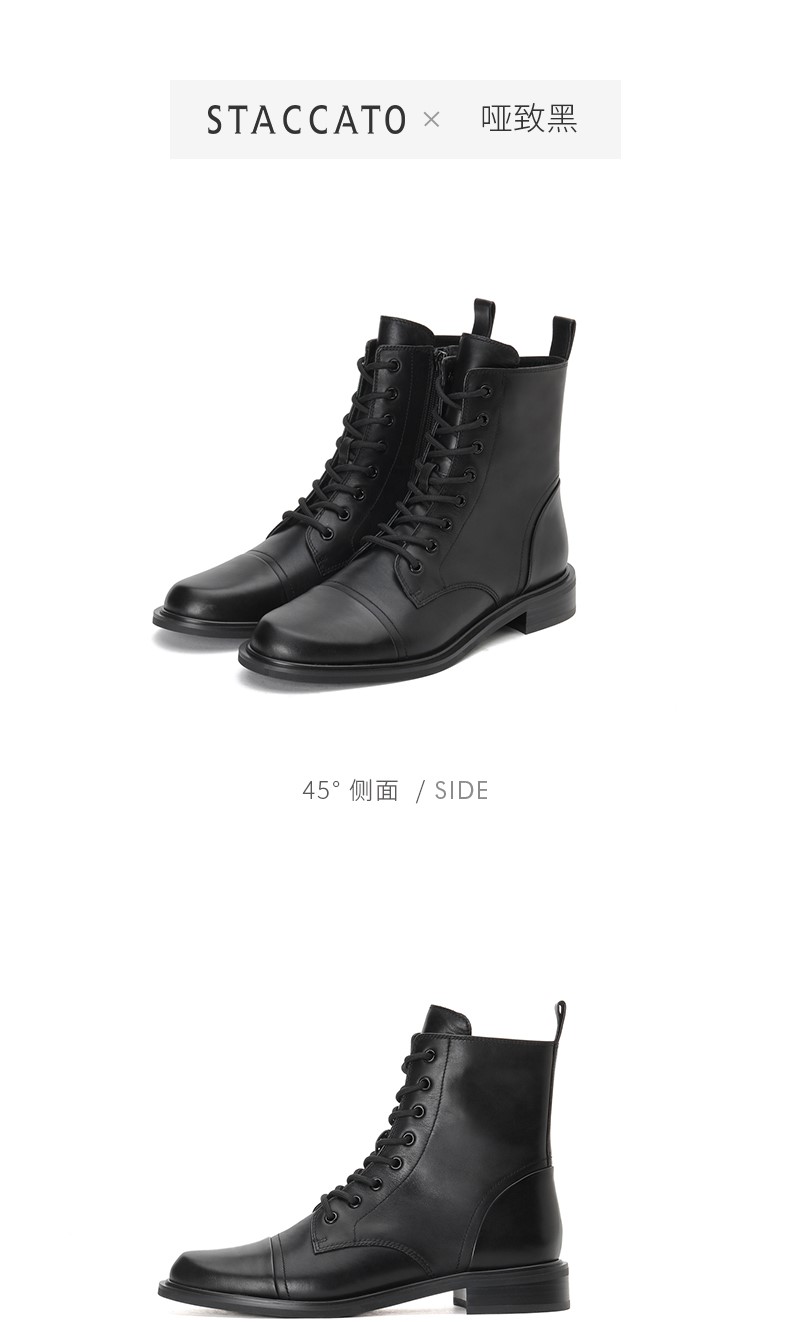 | 鞋底材质:橡胶底 | 靴筒内里材质:头层猪皮革 | 内增高:无 | 鞋面材质:牛皮革 | 闭合方式:系带侧拉链 |