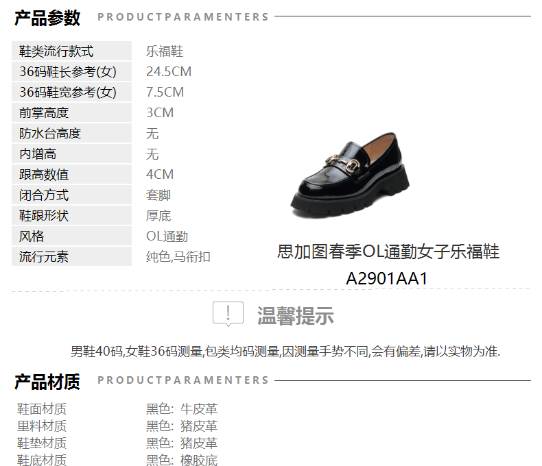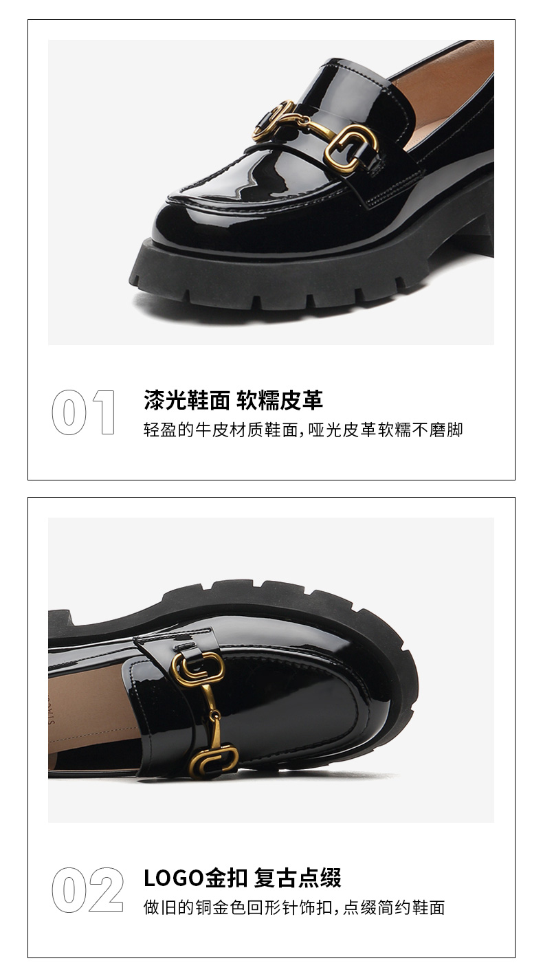 | 皮质特征:牛皮革 | 前掌高度:3CM | 防水台高度:无 | 鞋类流行款式:乐福鞋 |