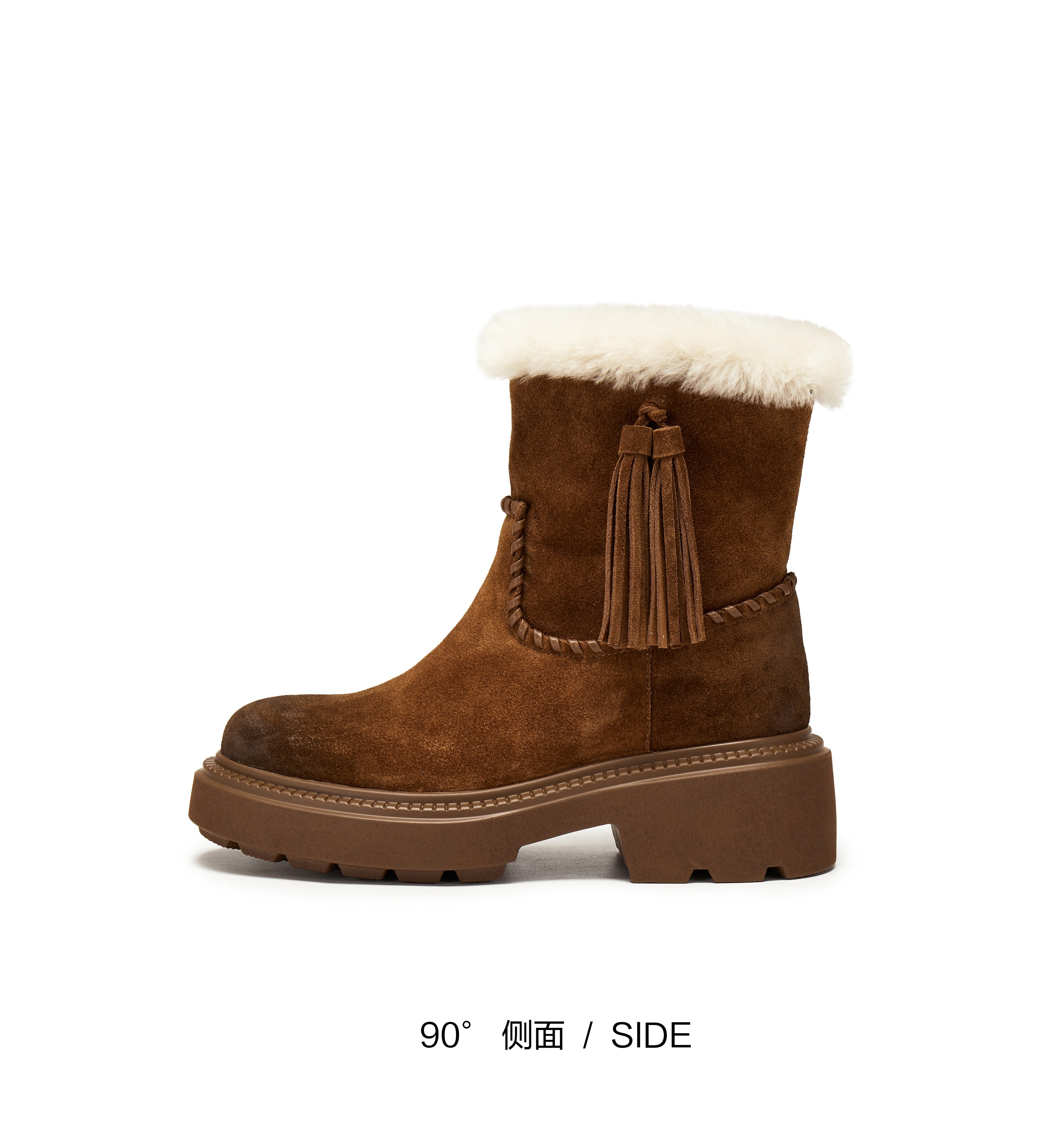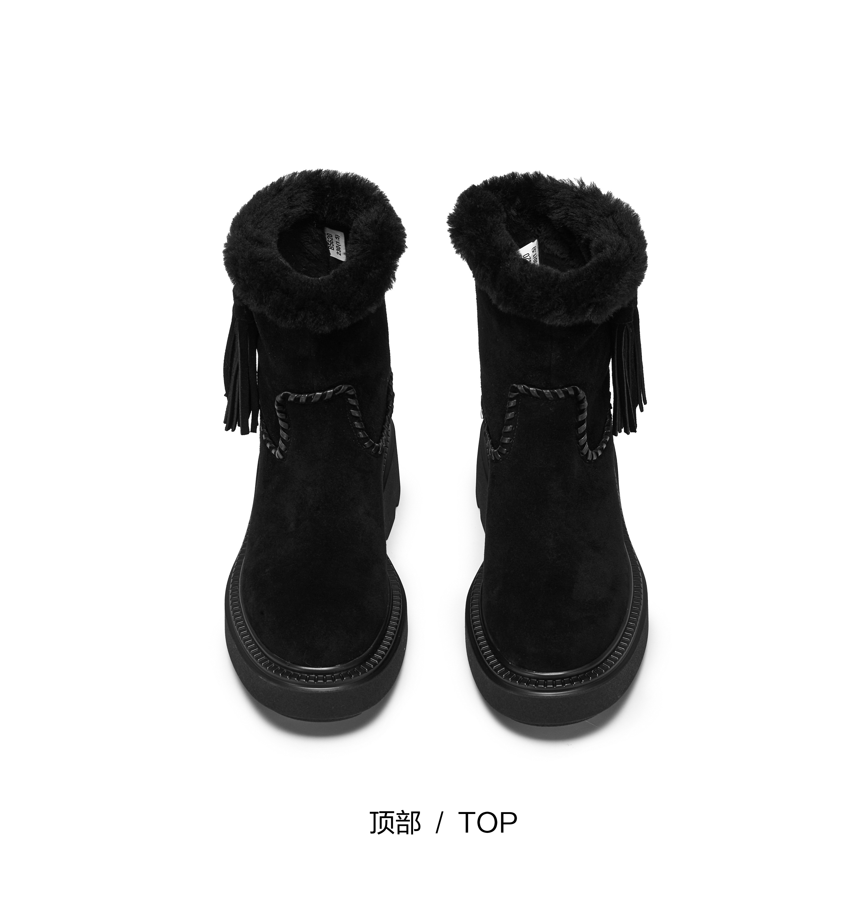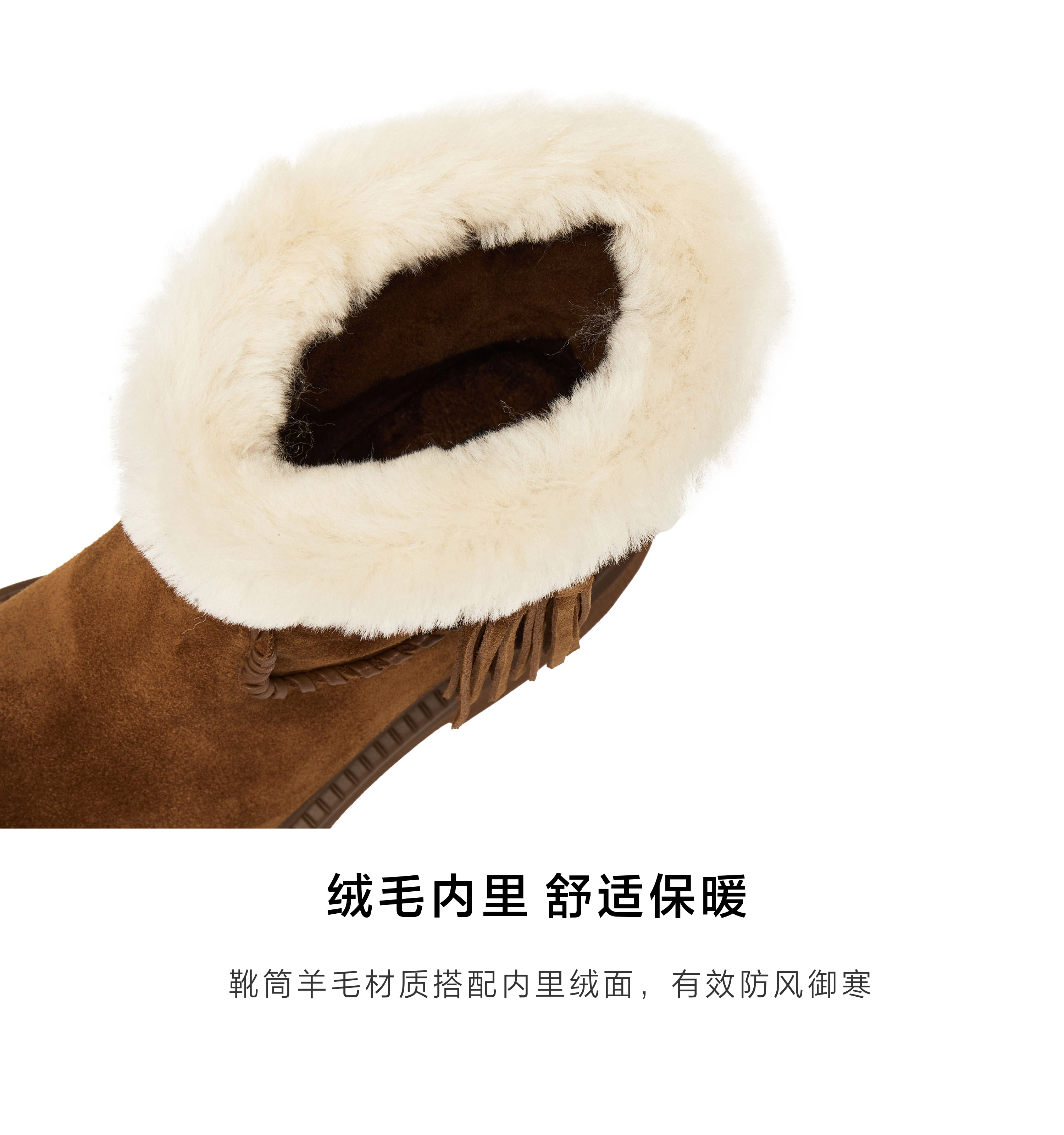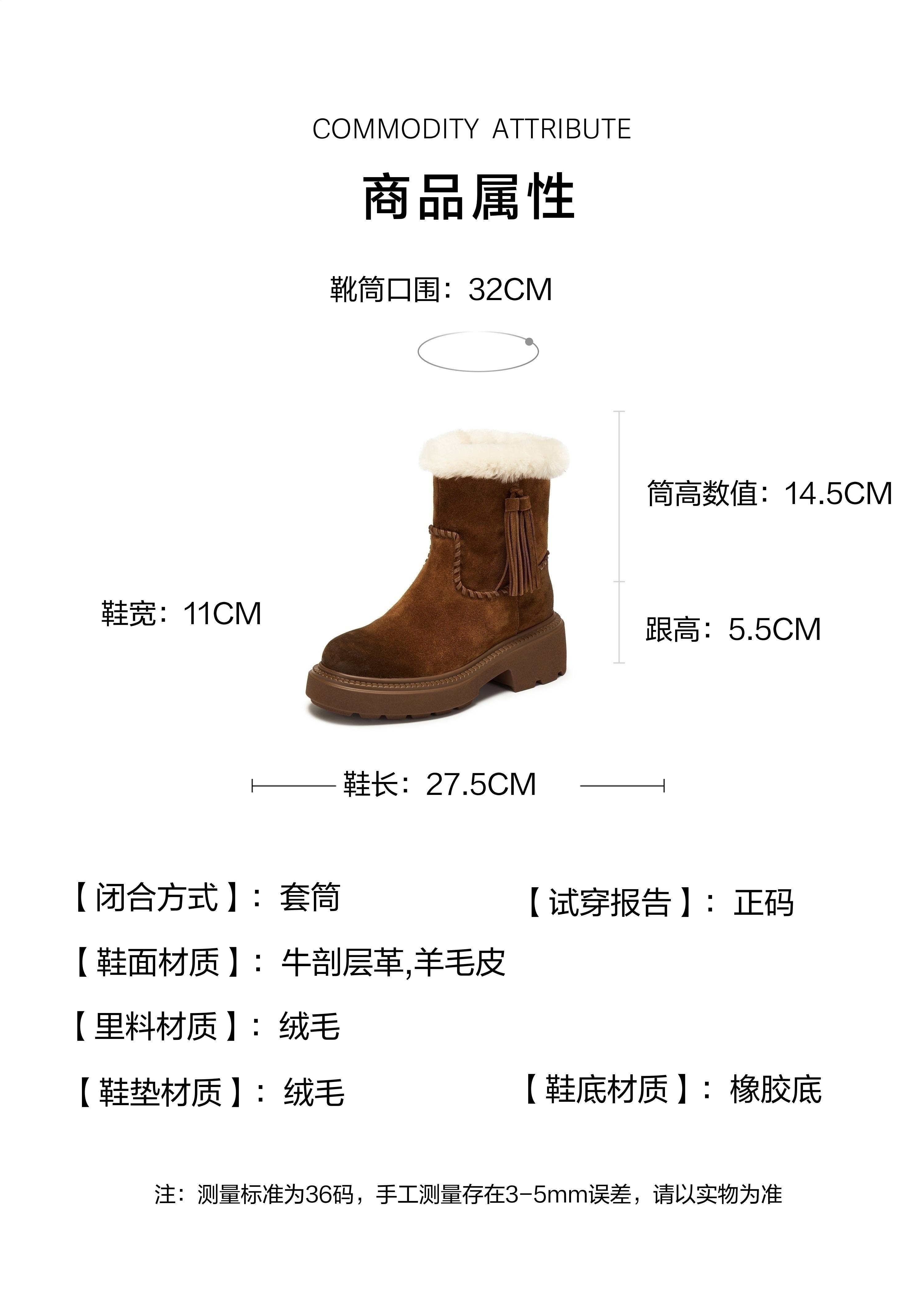 | 筒高数值:14.5CM | 靴筒筒面材质:羊毛皮牛剖层革 | 里料材质:绒毛 | 制鞋工艺:胶贴皮鞋 | 鞋垫材质:绒毛 |