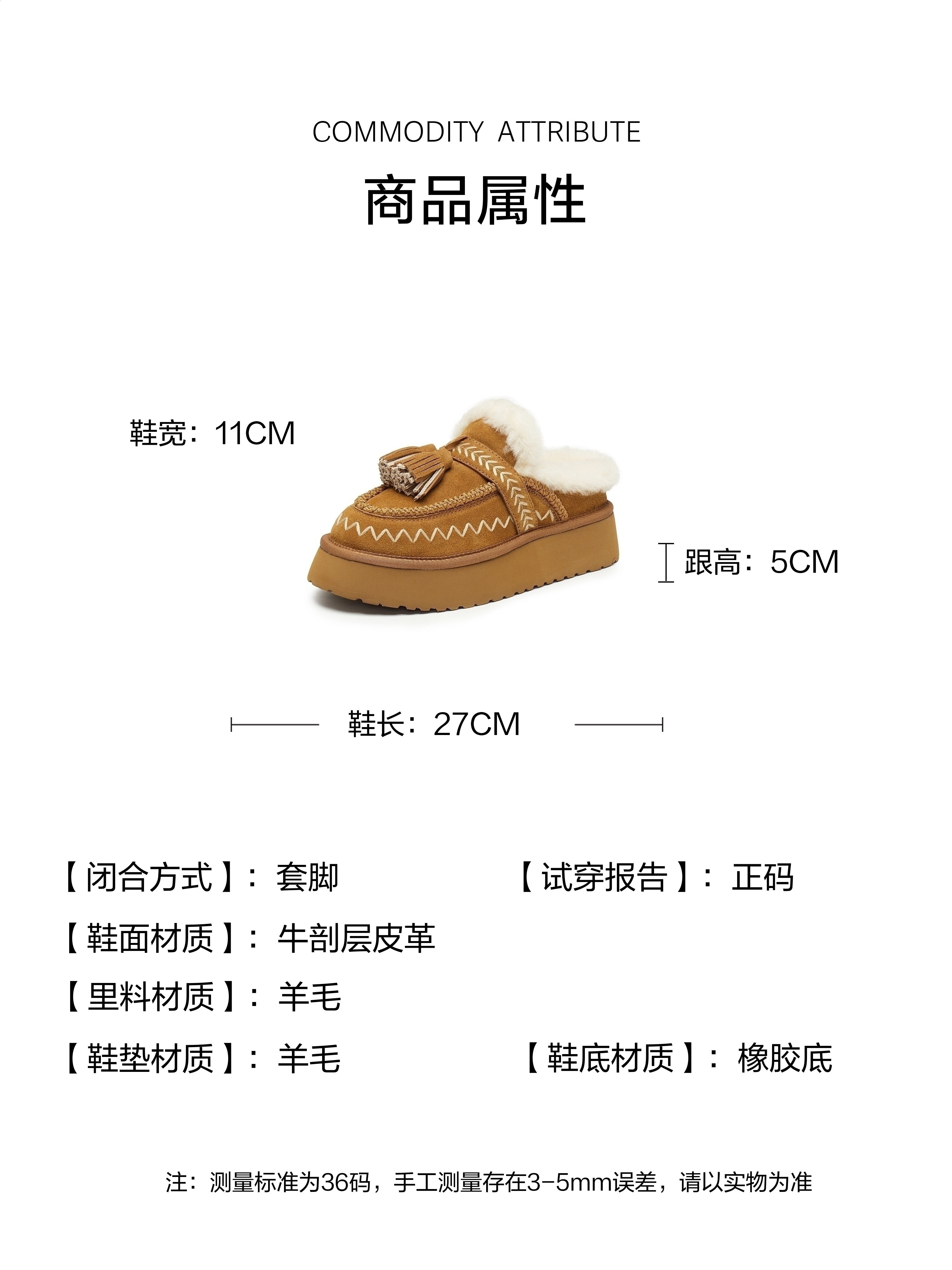 | 鞋垫材质:羊毛 | 款式季节:冬季 | 前掌高度:5CM | 防水台高度:5CM |