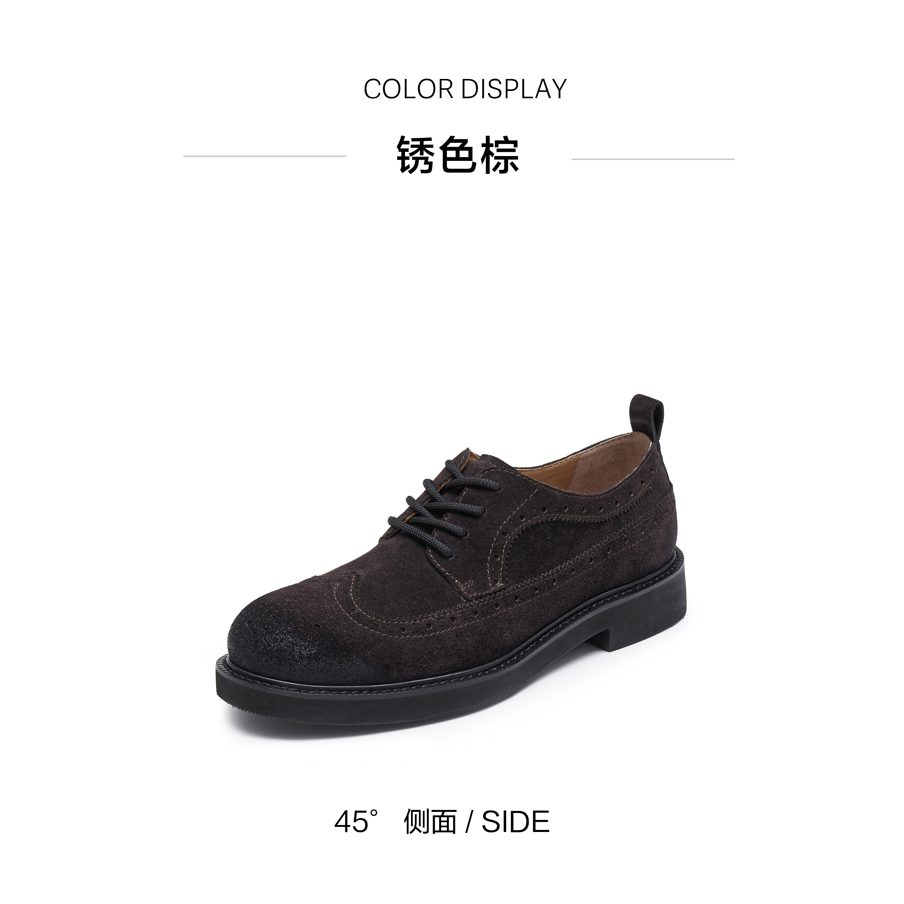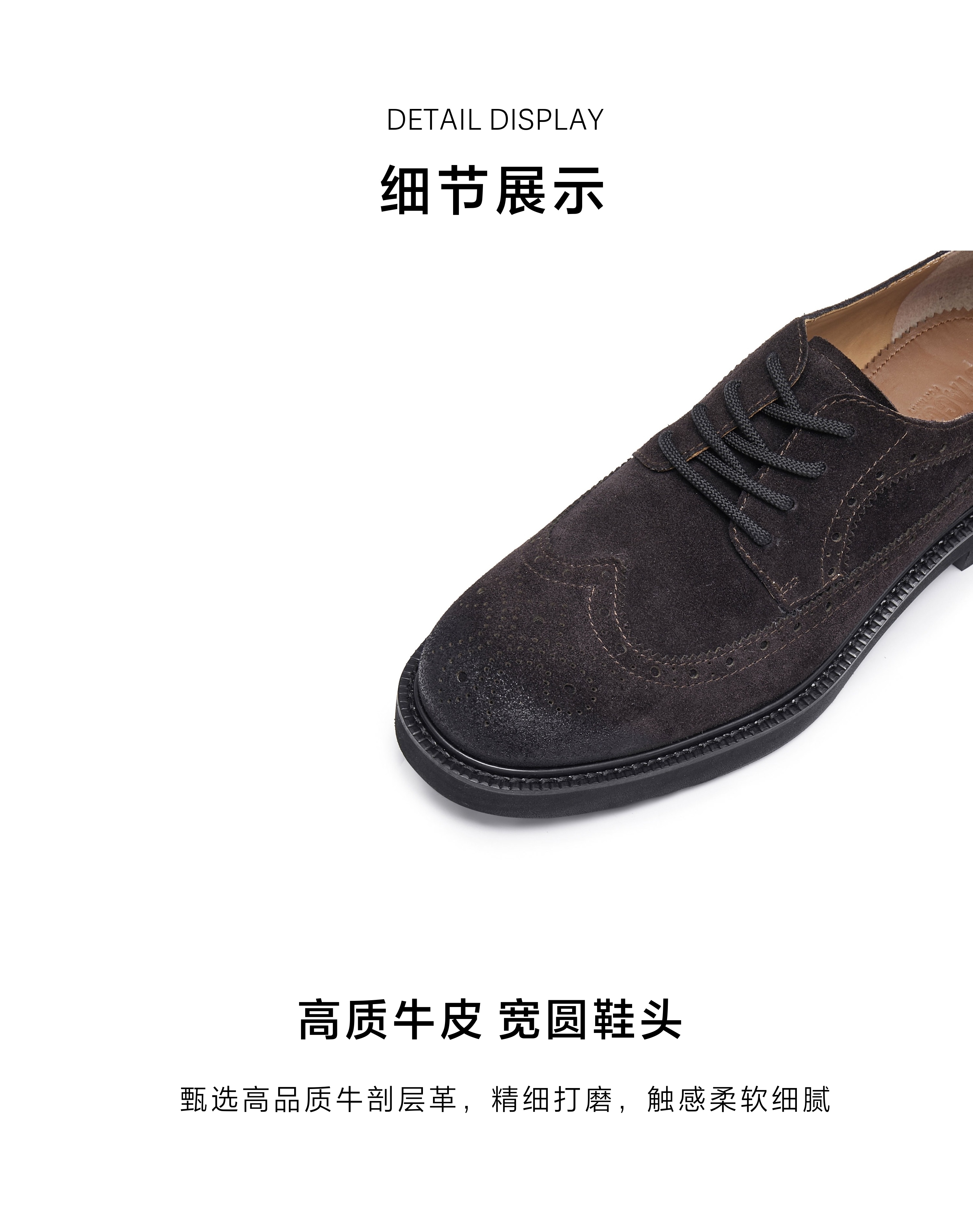 | 内增高:无 | 鞋跟形状:粗跟 | 鞋面材质:牛剖层革 | 流行元素:镂花 | 闭合方式:系带 |