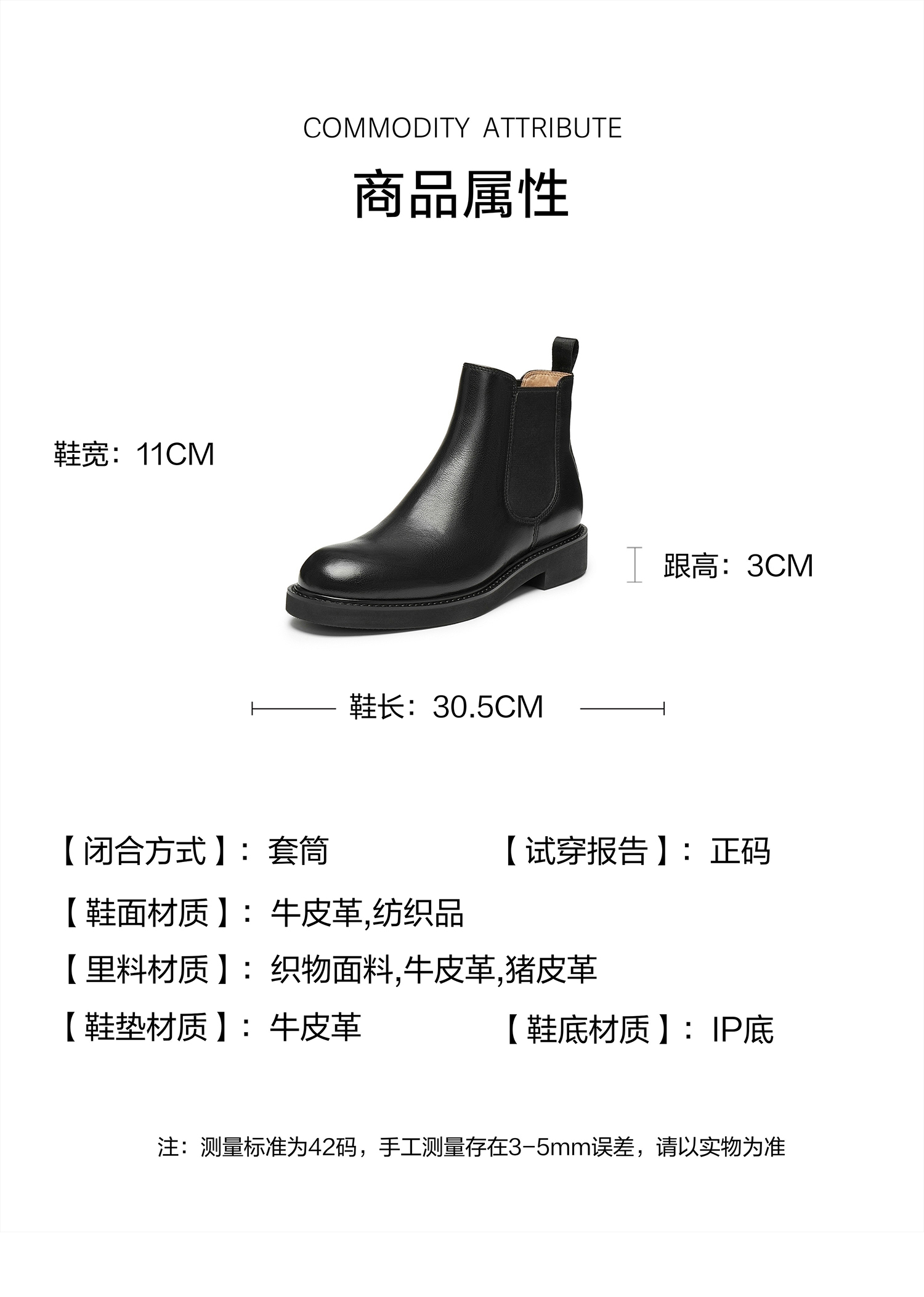 | 闭合方式:套筒 | 40码鞋宽参考(男):11CM | 靴筒口围:26.5CM | 上市时间:2024年冬季 | 鞋类流行款式:切尔西靴 |