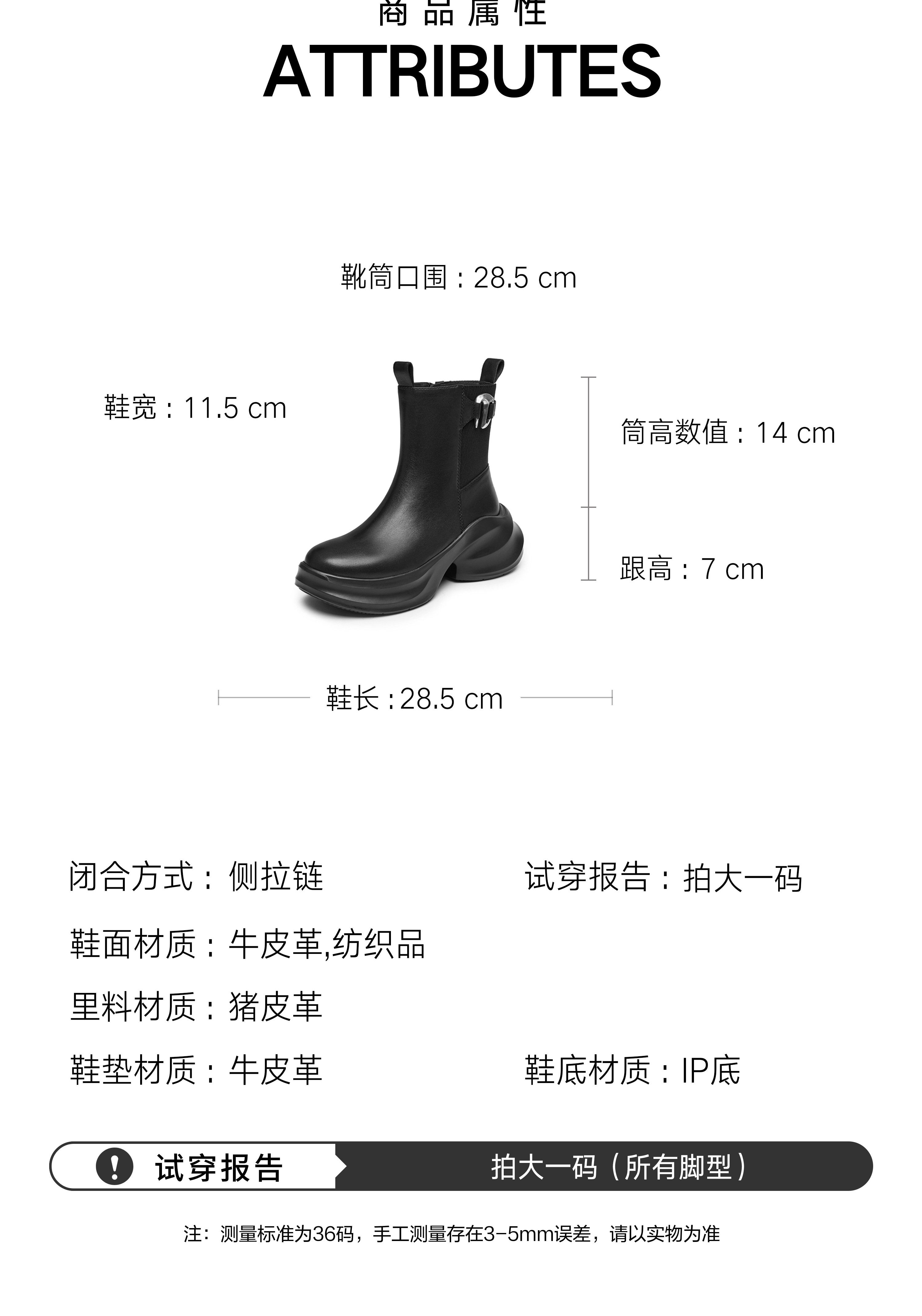 | 鞋底材质:IP底 | 靴筒内里材质:猪皮革 | 内增高:无 | 鞋面材质:纺织品牛皮革 | 闭合方式:侧拉链 |