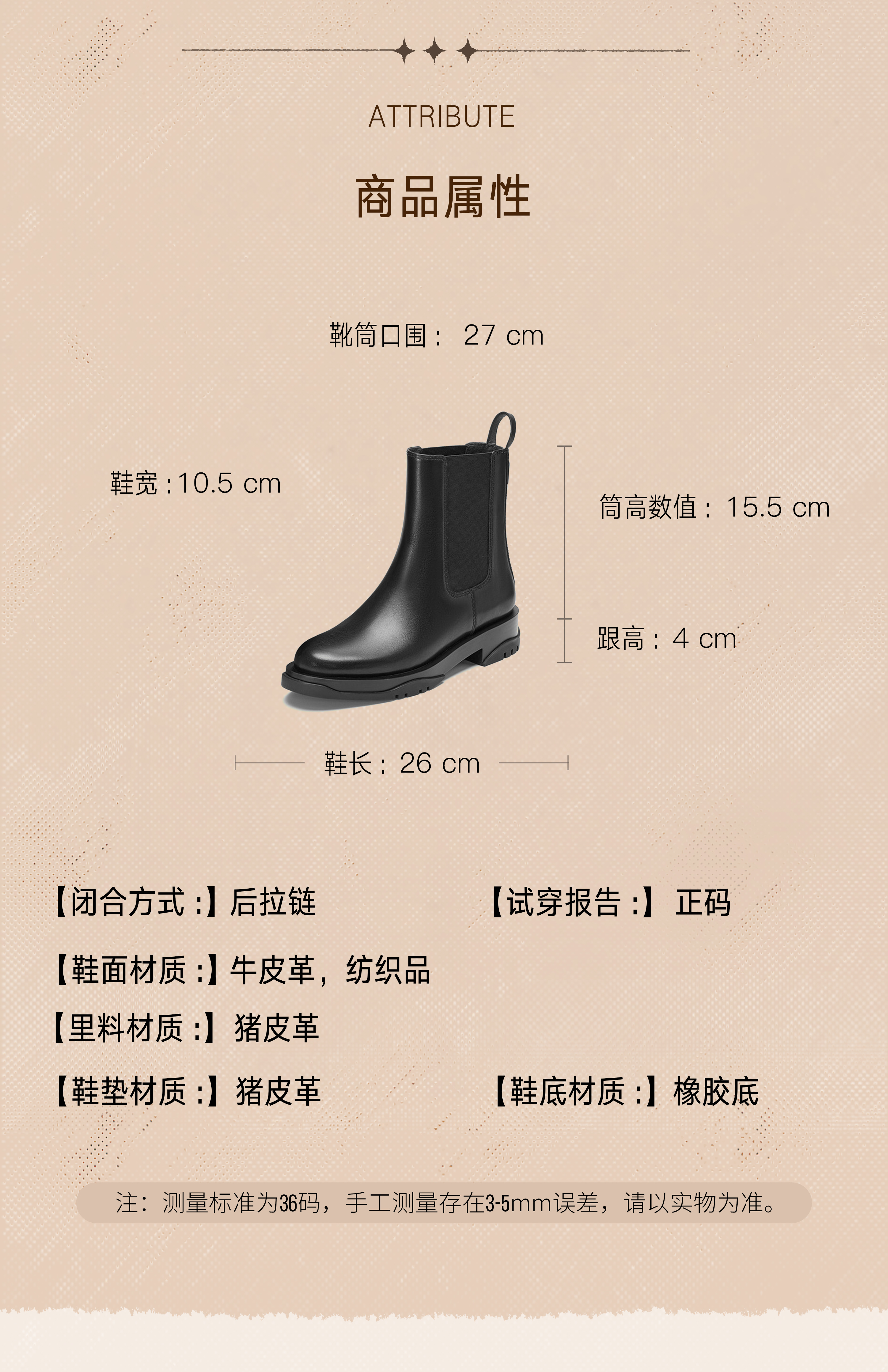 | 配跟:无 | 靴筒口围:27CM | 上市时间:2024年冬季 | 鞋类流行款式:切尔西靴 | 鞋头款式:圆头 |