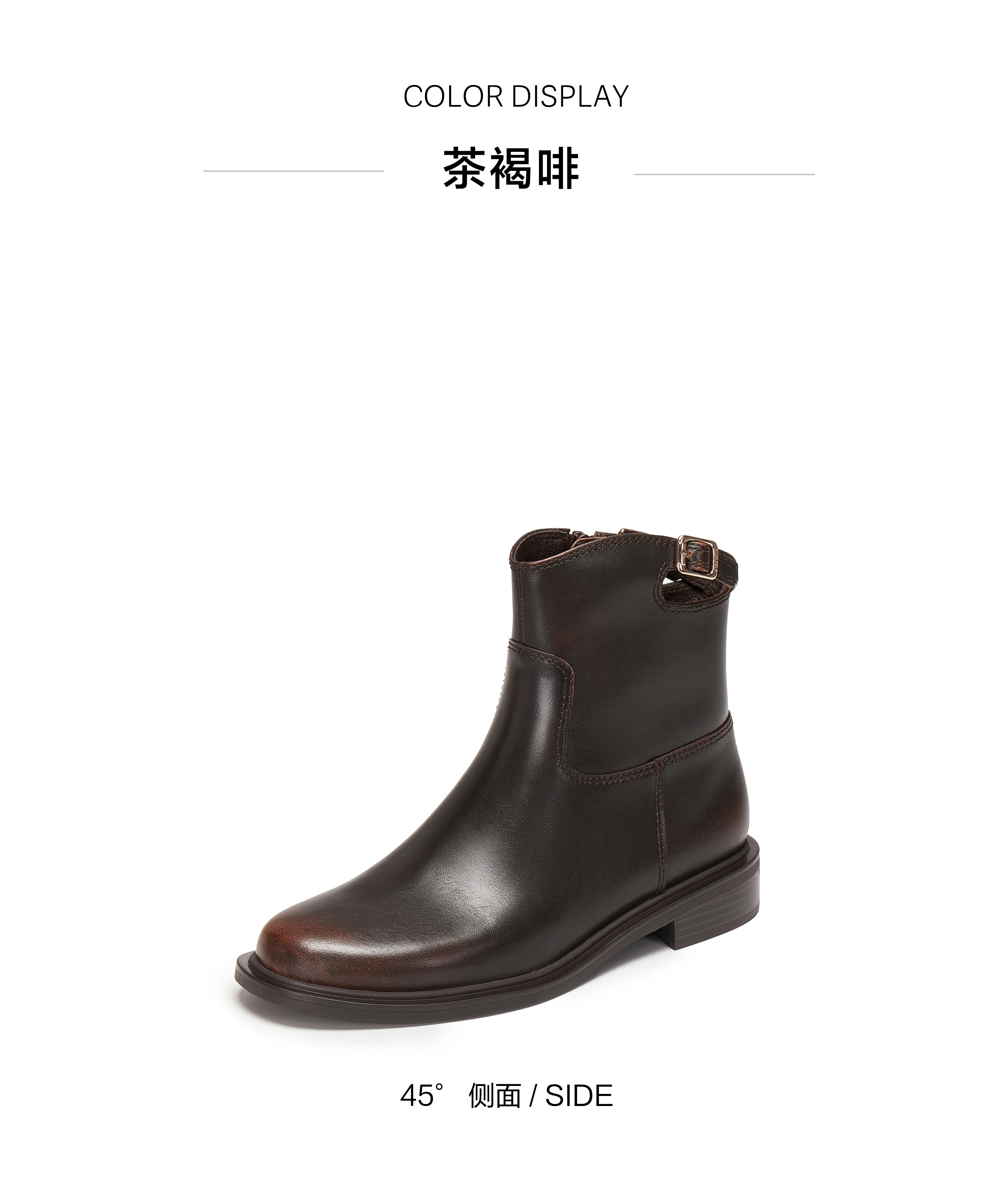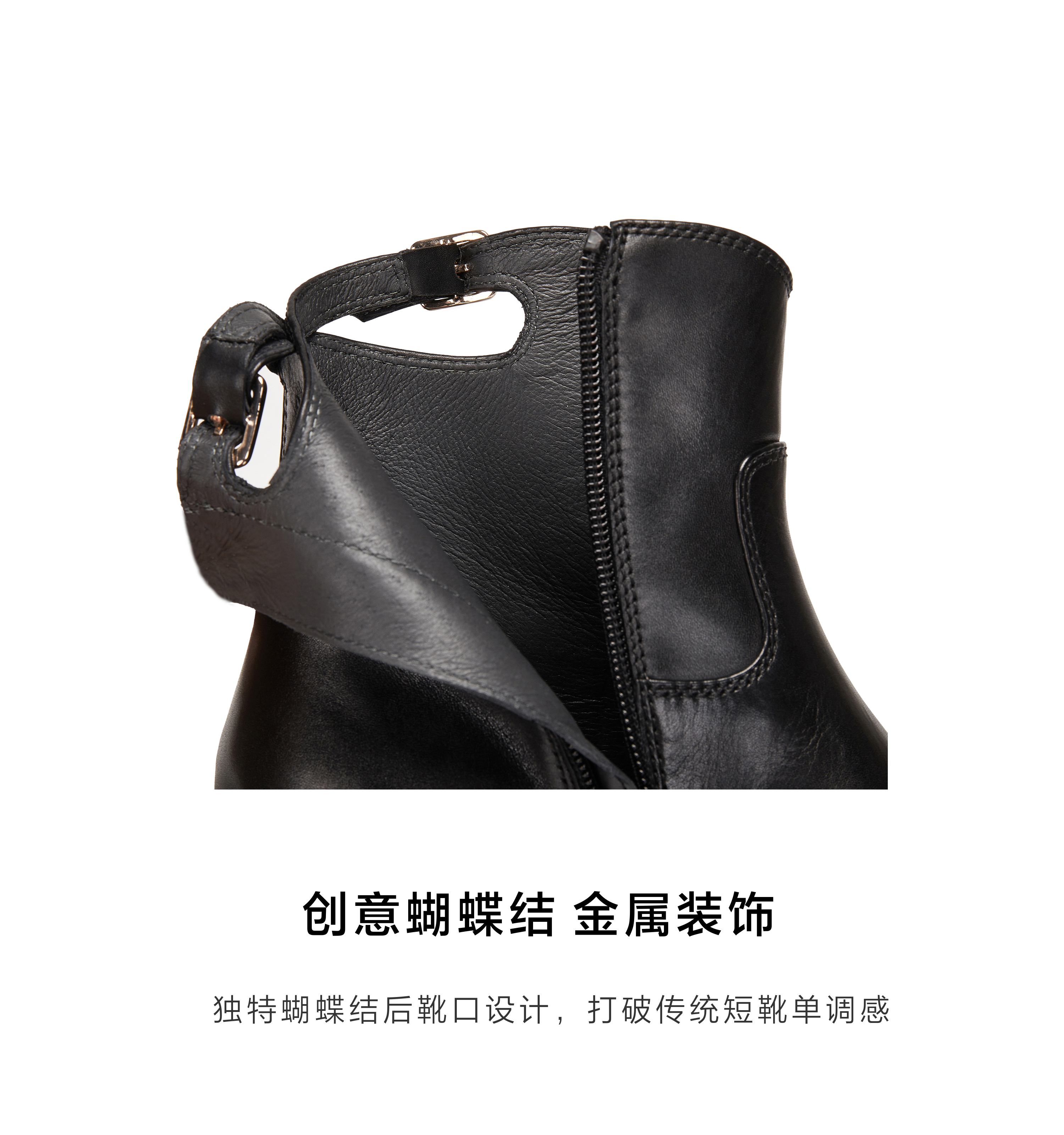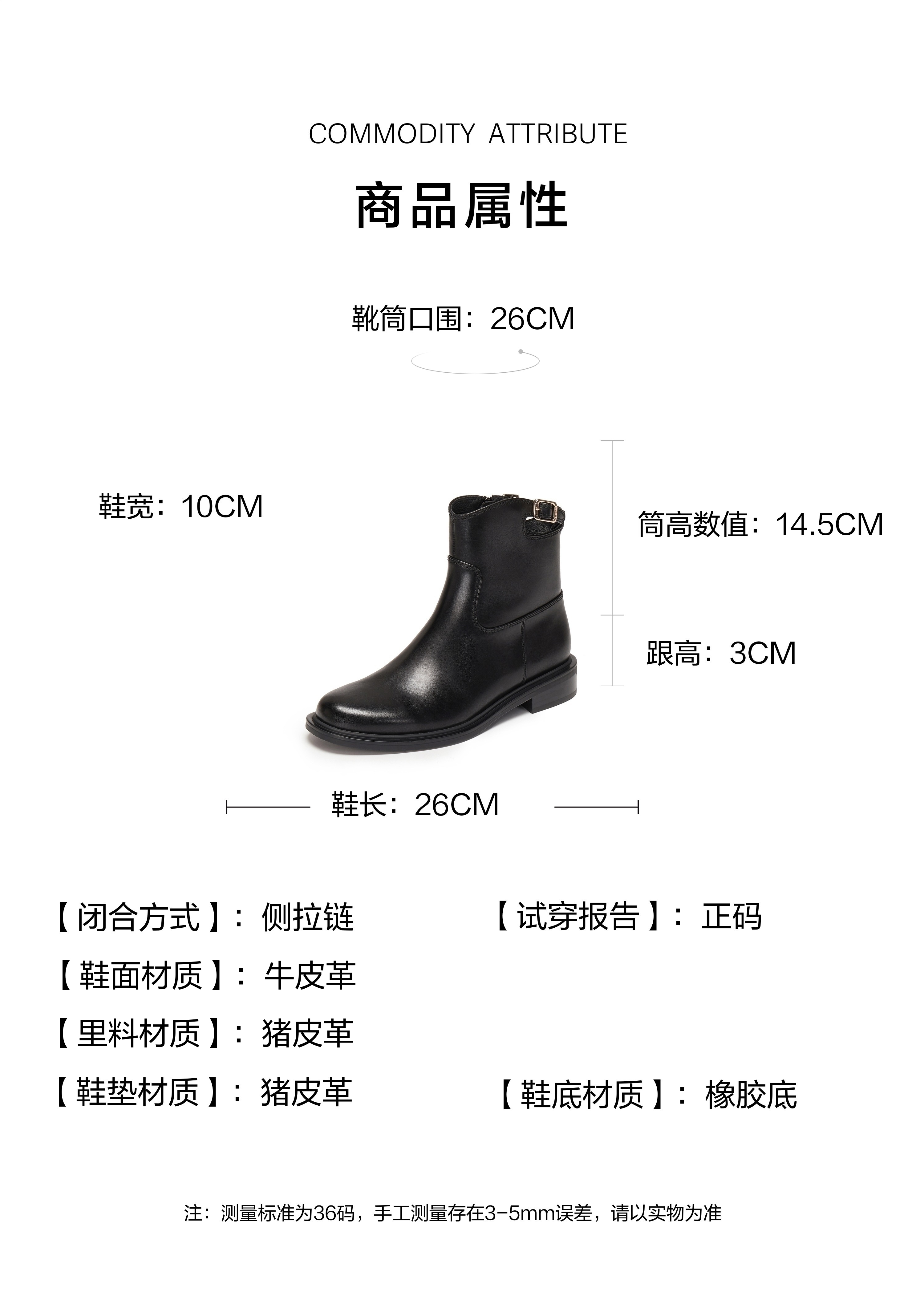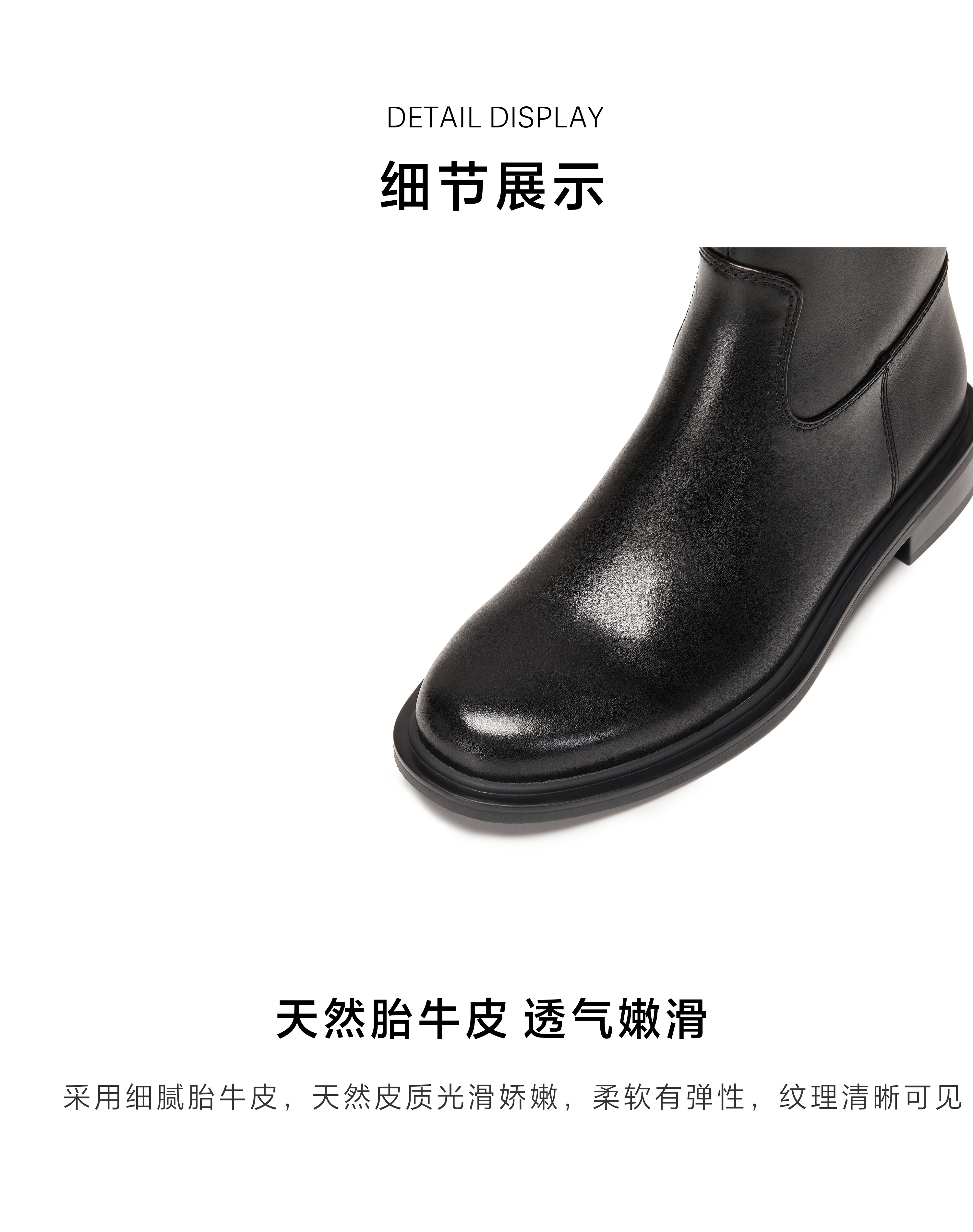 | 鞋底材质:橡胶底 | 靴筒内里材质:织物猪皮革 | 内增高:无 | 鞋面材质:牛皮革 | 闭合方式:侧拉链 |