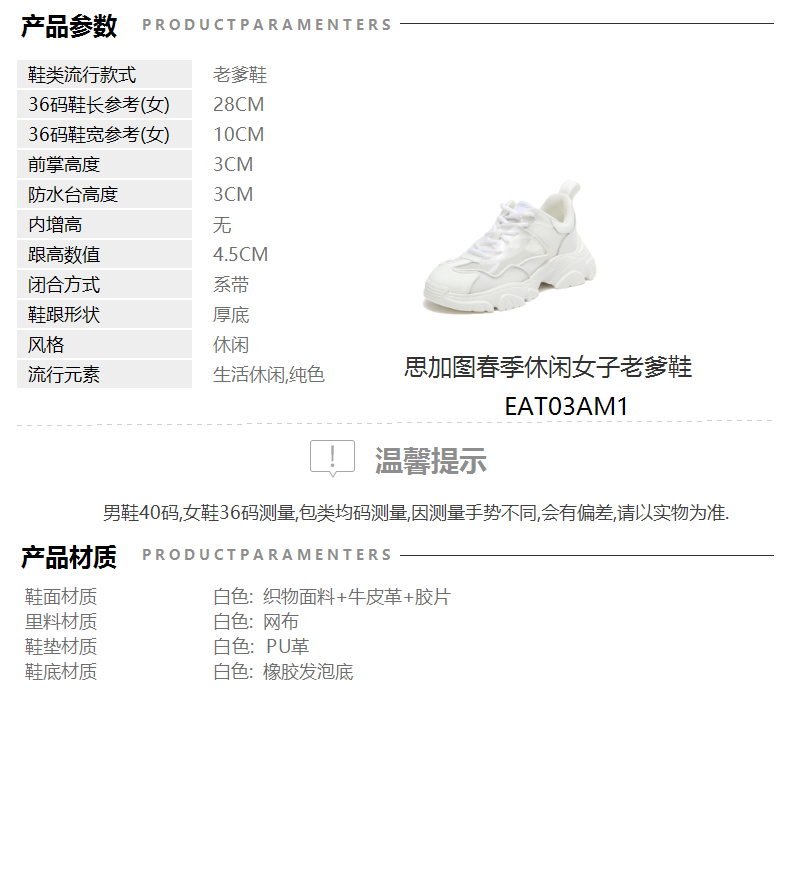 | 色系:白色 | 跟高数值:4.5CM | 性别:女子 | 里料材质:网布 | 制鞋工艺:胶贴皮鞋 |