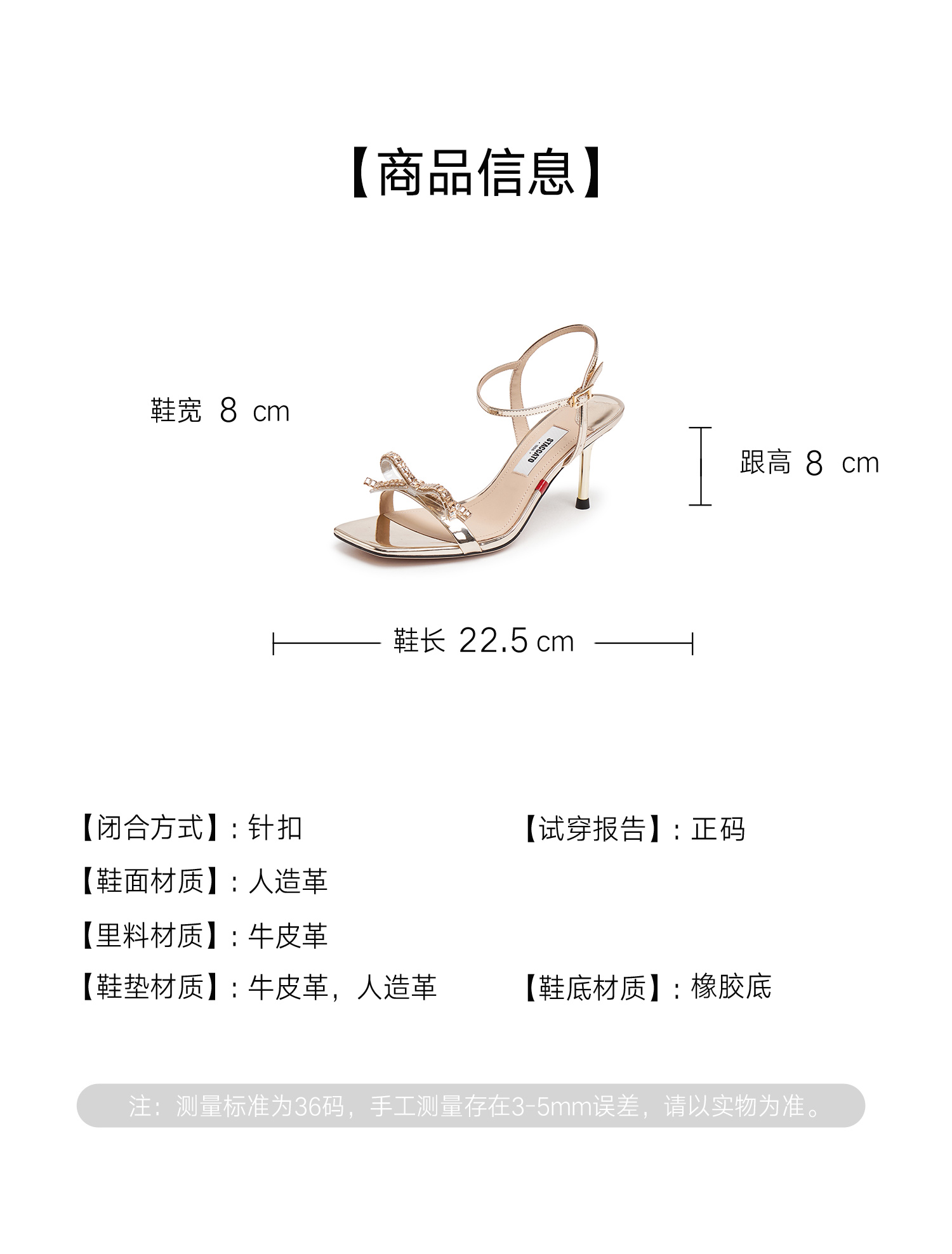 | 年份:2025年 | 色系:金色 | 参考标准尺码:36码 | 跟高数值:8CM | 性别:女子 |
