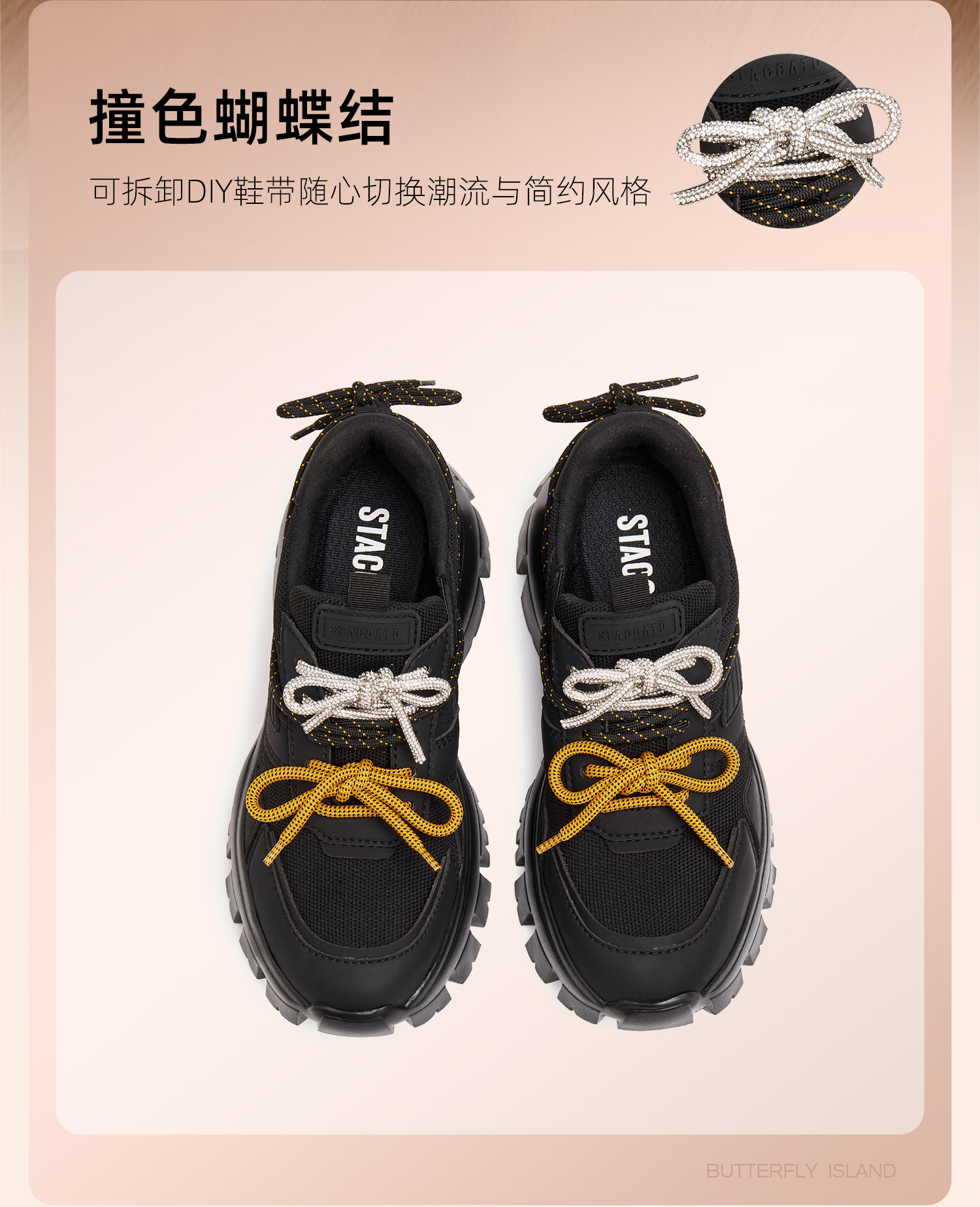 思加图(STACCATO),一个代表着年轻时尚、多元化的时装鞋履品牌,目标将时尚潮流带到女性的现实生活中。“STACCATO”是乐章上的音符,轻轻一点,谱出优美的旋律,为音乐带来多样性。穿上STACCATO单鞋的时代女性,踏出自信又轻松的脚步,犹如跳跃的音符,反映年轻与时尚的生活态度。目前品牌开设门店已超1100家,遍布中国、韩国、澳洲、新加坡、马来西亚、罗马尼亚、沙特阿拉伯等地。