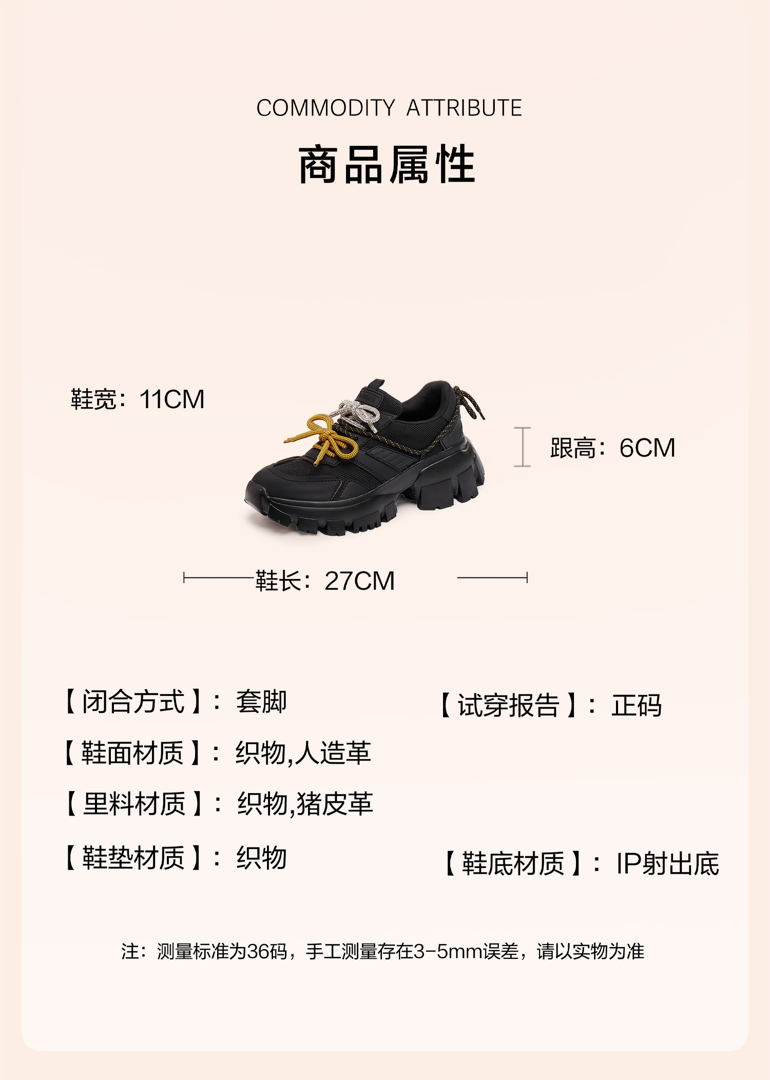 | 闭合方式:套脚 | 风格:时尚潮流 | 色系:黑色 | 跟高数值:6CM | 配跟:无 |