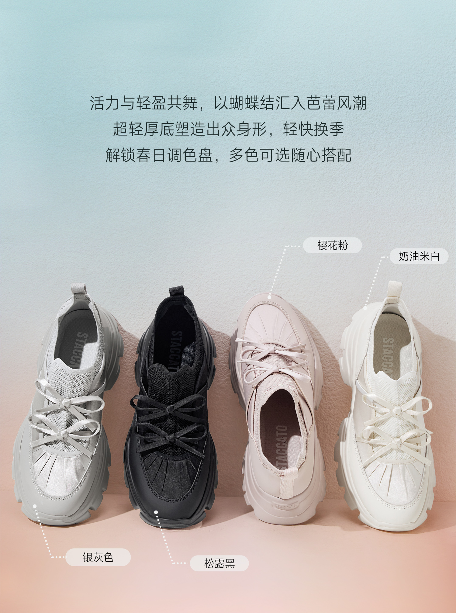 思加图(STACCATO),一个代表着年轻时尚、多元化的时装鞋履品牌,目标将时尚潮流带到女性的现实生活中。“STACCATO”是乐章上的音符,轻轻一点,谱出优美的旋律,为音乐带来多样性。穿上STACCATO单鞋的时代女性,踏出自信又轻松的脚步,犹如跳跃的音符,反映年轻与时尚的生活态度。目前品牌开设门店已超1100家,遍布中国、韩国、澳洲、新加坡、马来西亚、罗马尼亚、沙特阿拉伯等地。