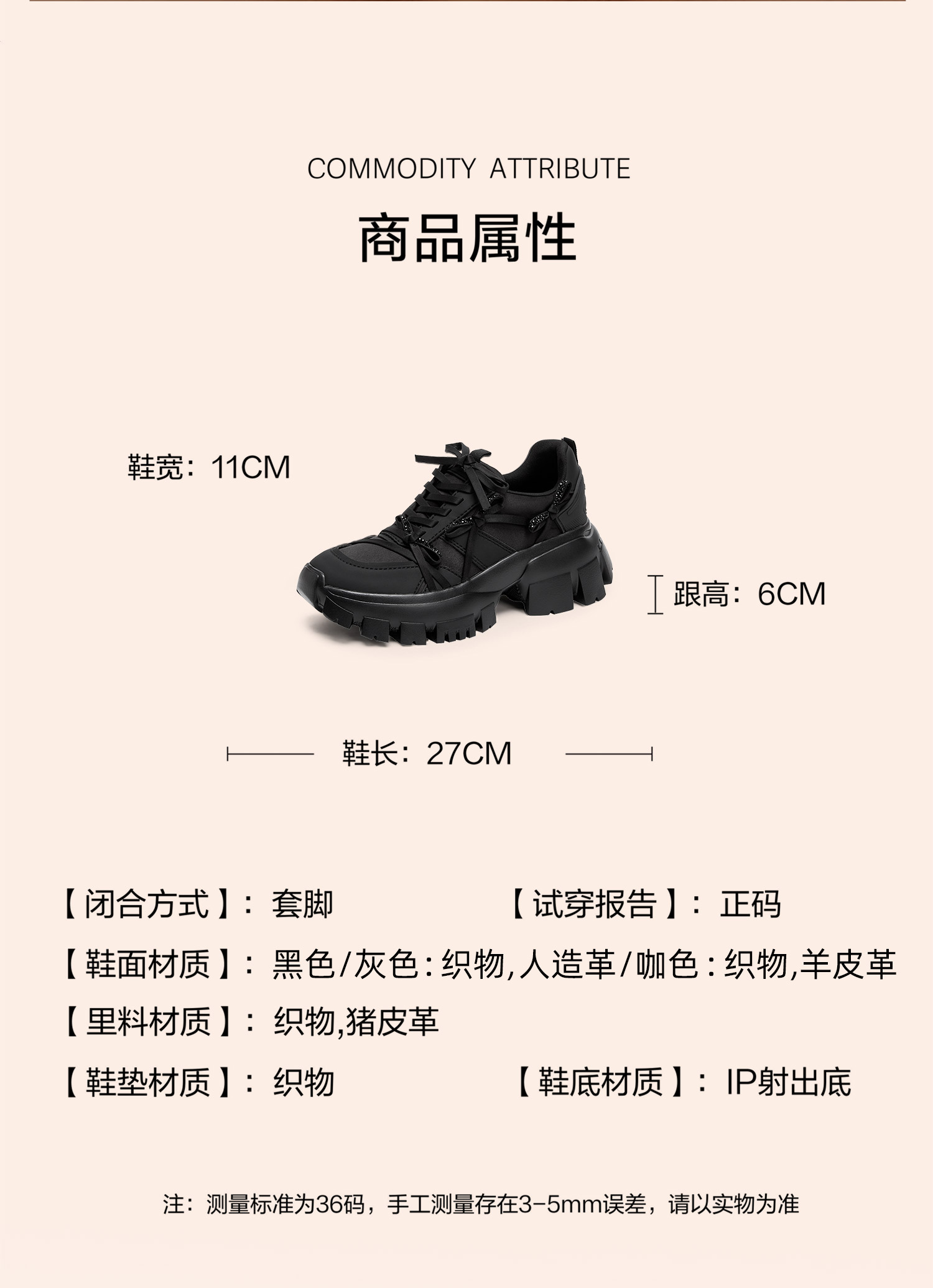 | 鞋垫材质:织物 | 皮质特征:织物/人造革 | 鞋类流行款式:老爹鞋 |