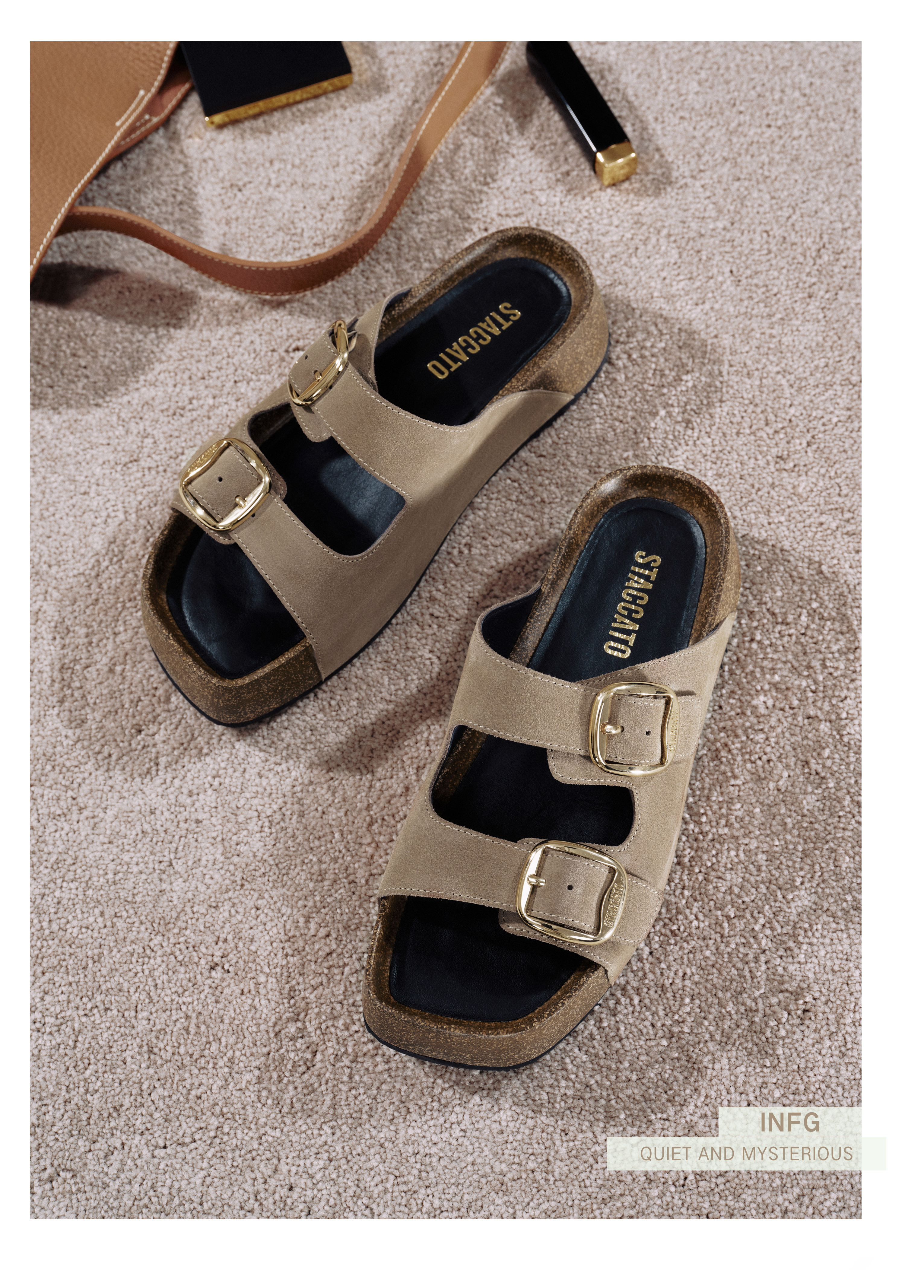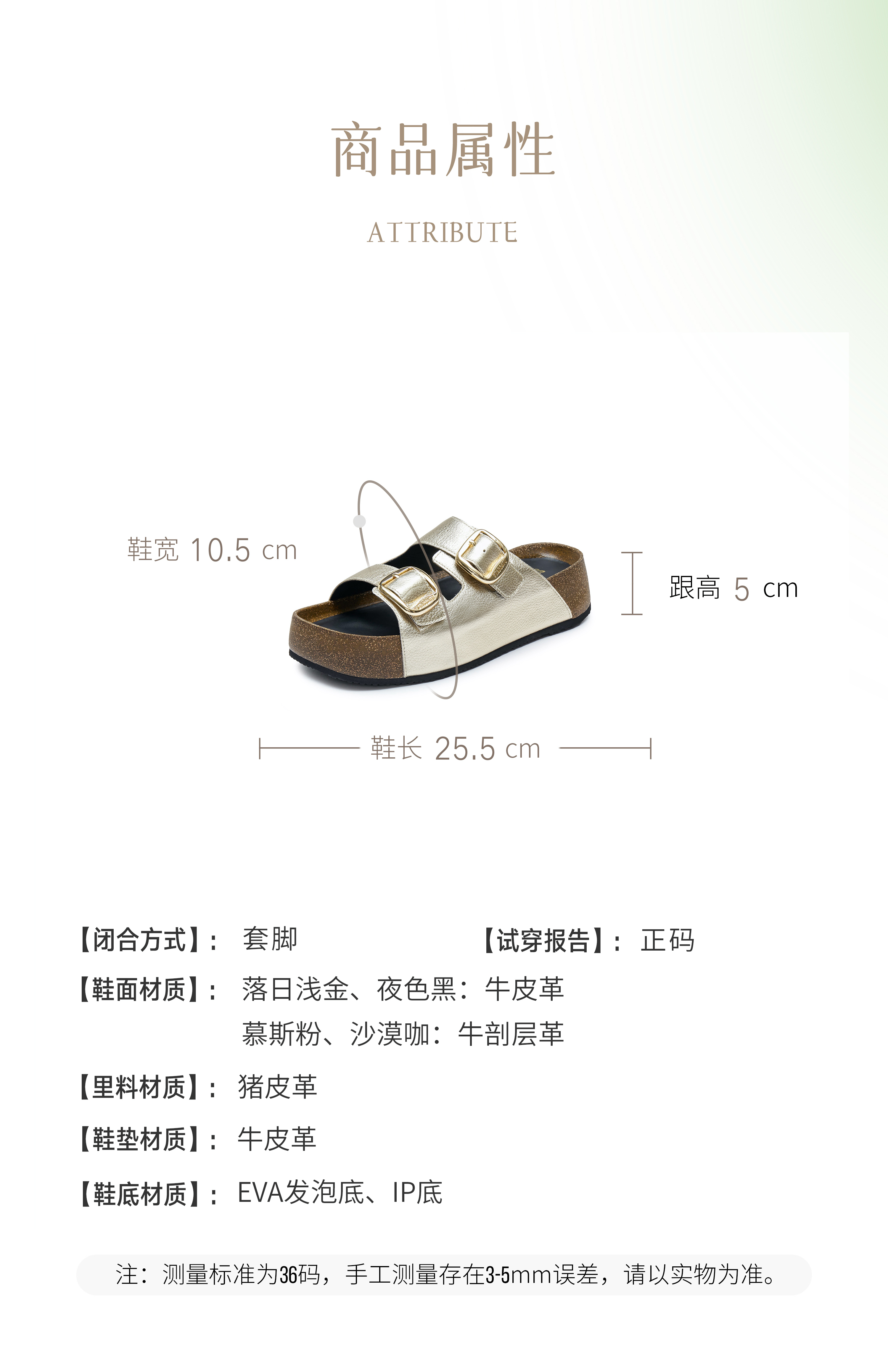 | 渠道划分:线下同步 | 前掌高度:3CM | 皮质特征:牛皮革 | 防水台高度:3CM | 销售季:2025年夏季 |