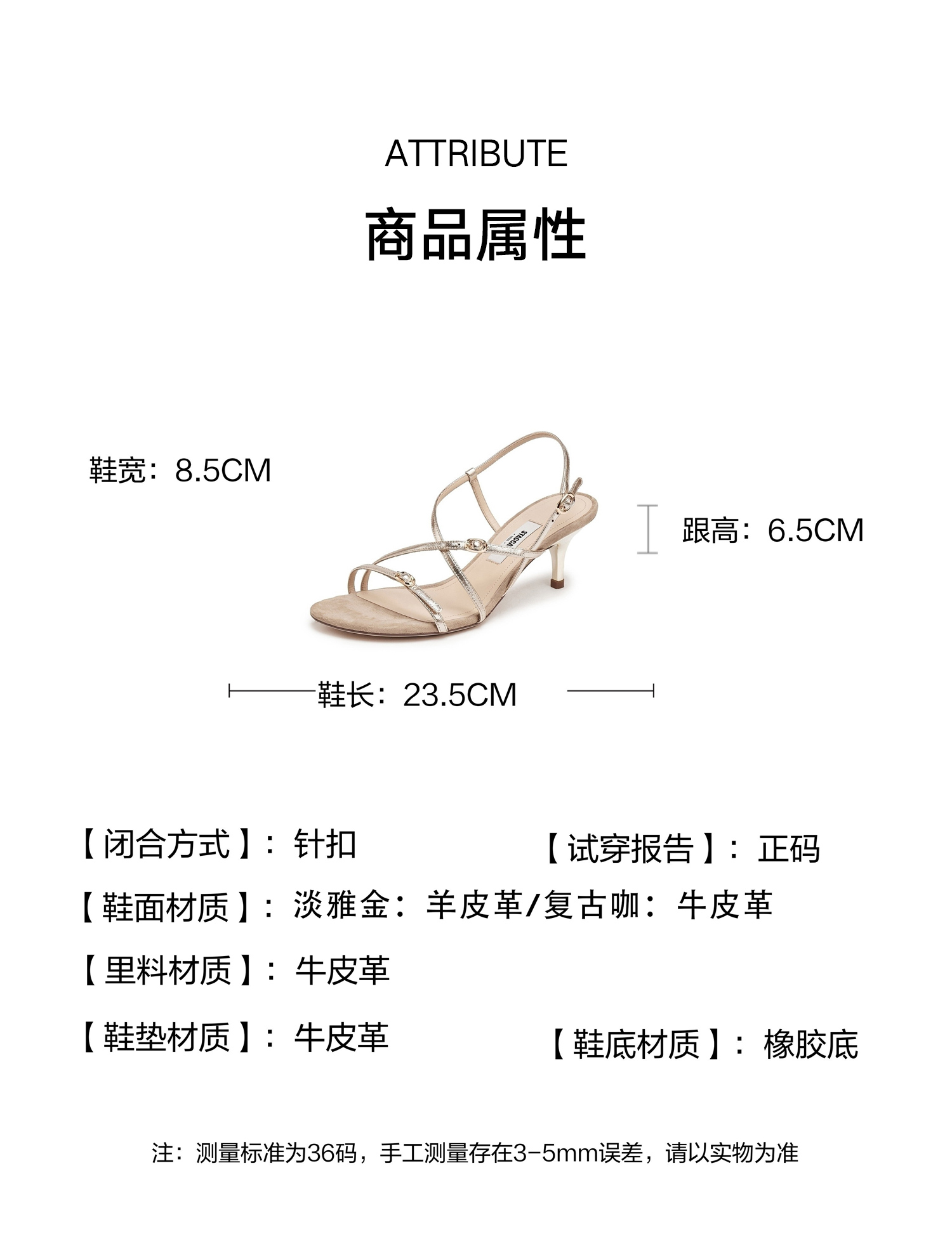 | 鞋头款式:圆头 | 执行标准:皮凉鞋GB/T22756-2017 | 跟高范围:高跟鞋(6-8CM) | 鞋面图案:纯色 | 鞋跟形状:细跟 |