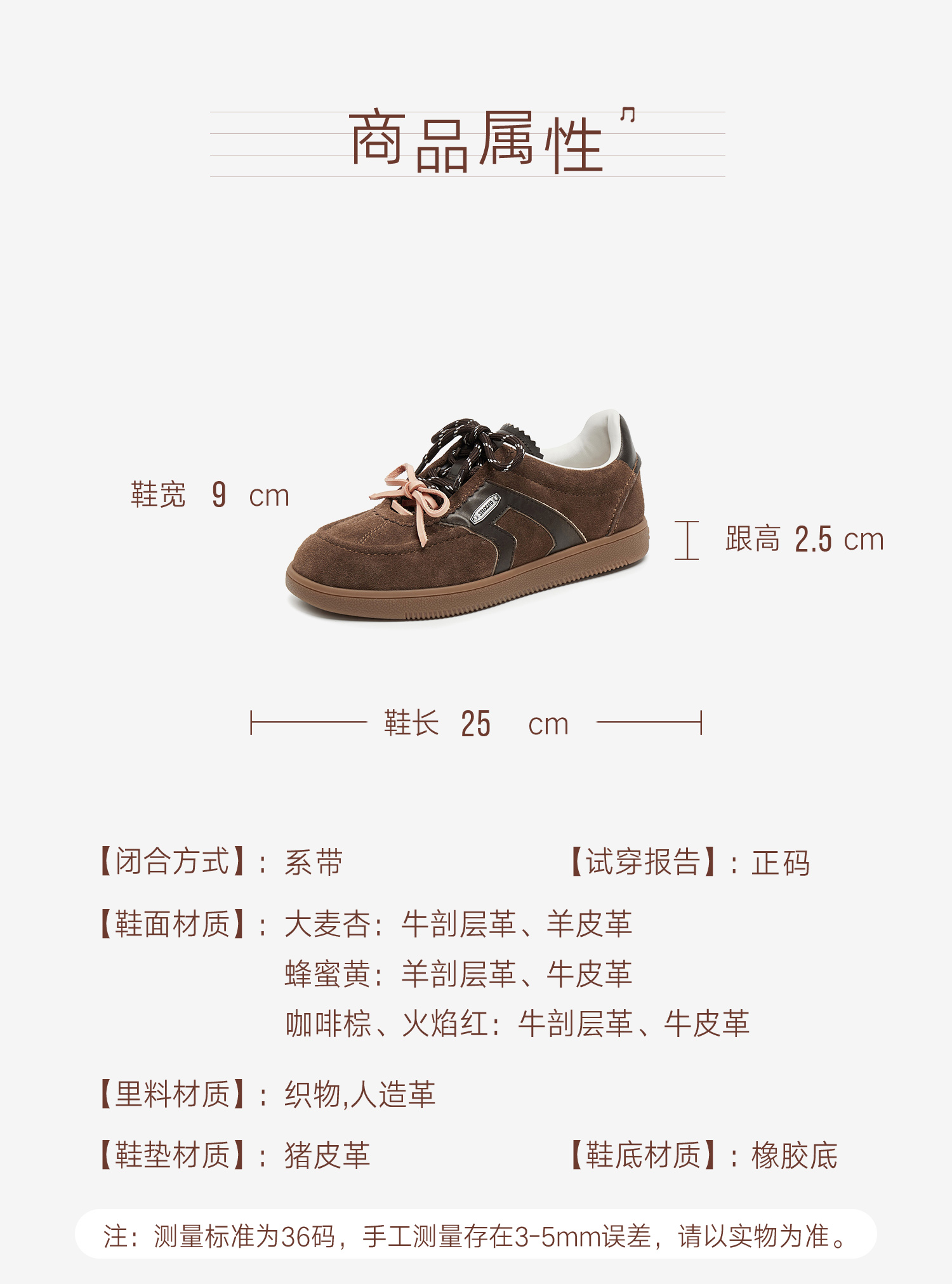 | 鞋面材质:牛剖层革羊皮革 | 流行元素:撞色 | 参考鞋长(女):25CM | 参考鞋宽(女):9CM | 闭合方式:系带 |