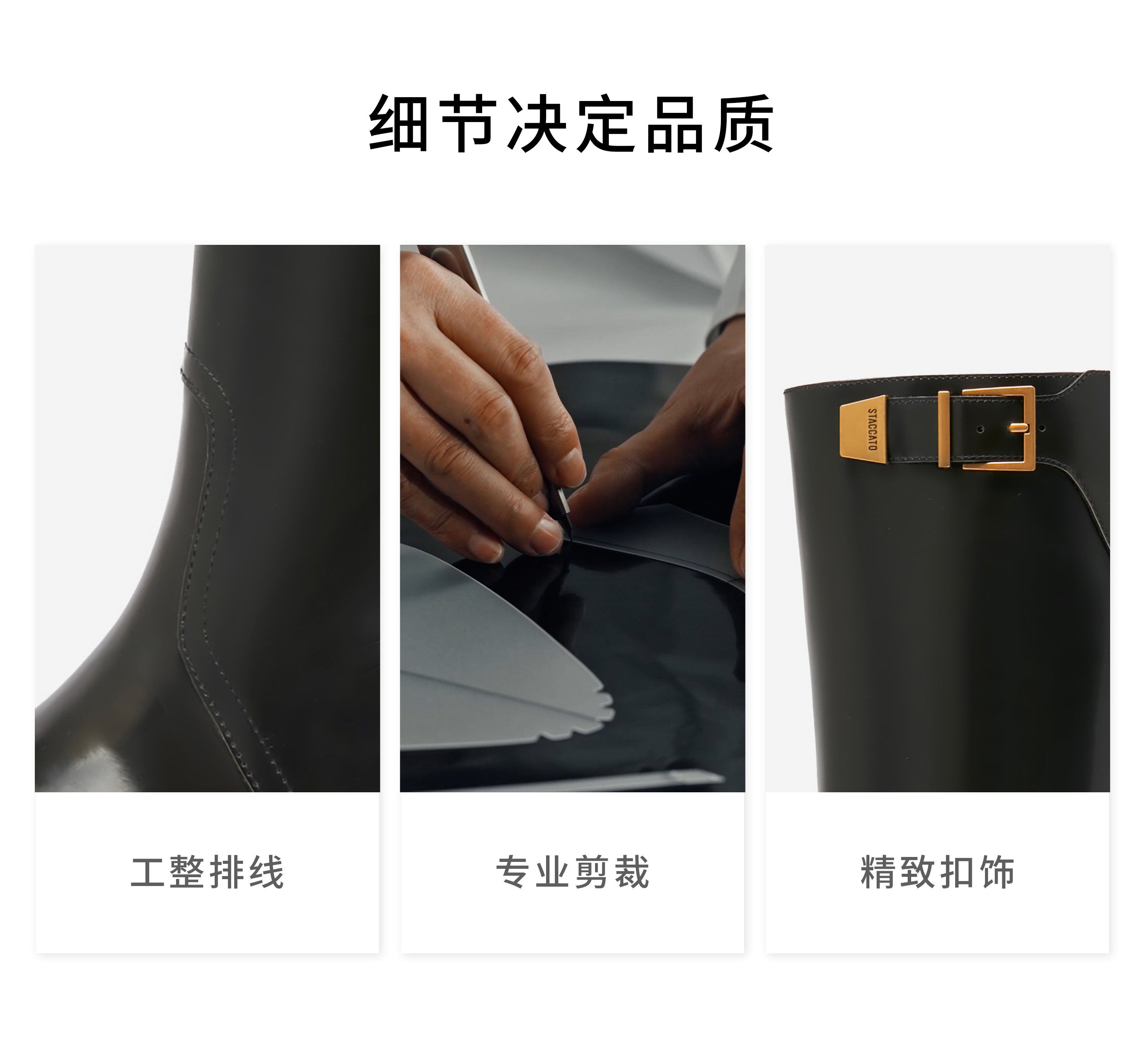 | 鞋底材质:IP底 | 靴筒内里材质:猪皮革 | 内增高:无 | 鞋面材质:牛皮革 | 闭合方式:后拉链 |