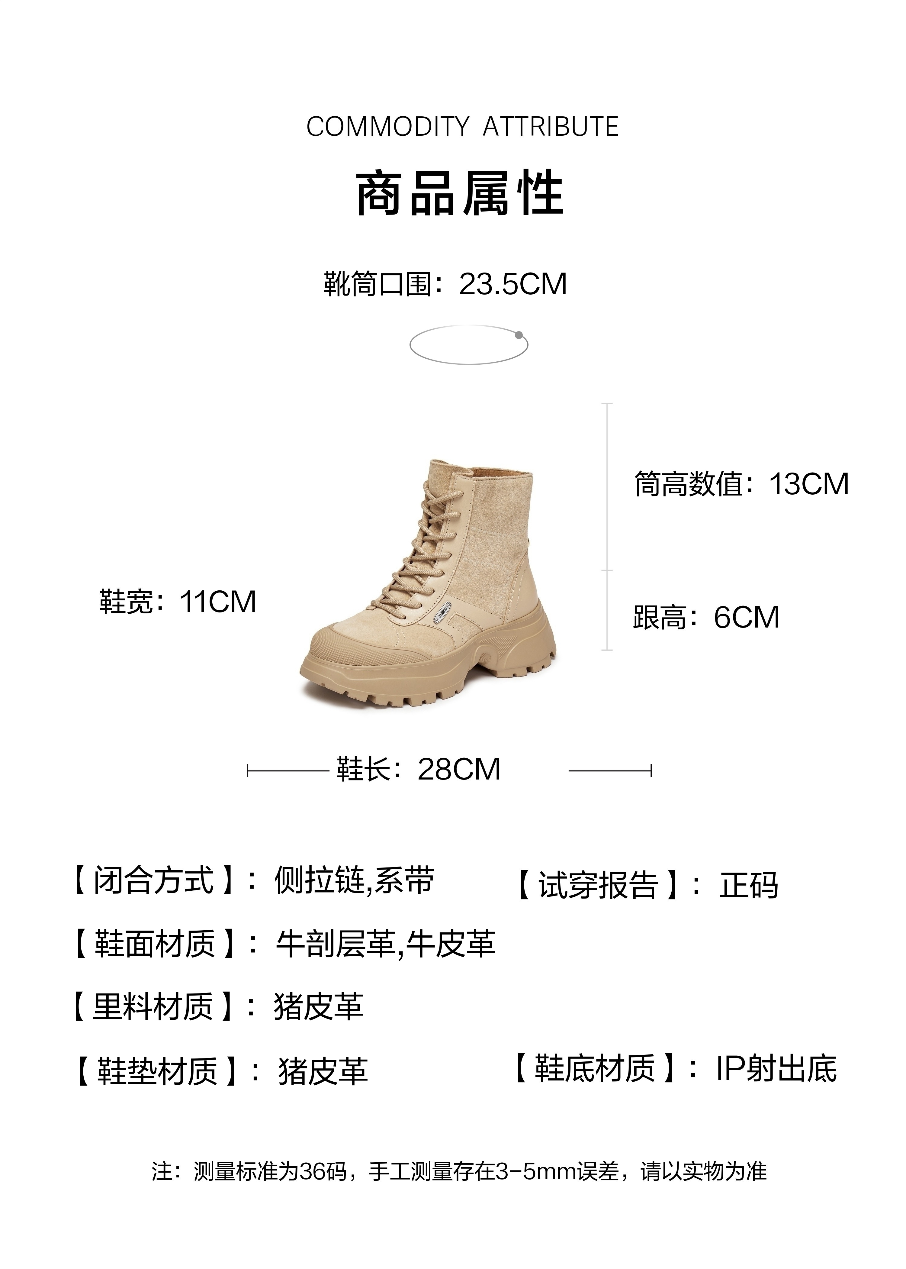 | 鞋底材质:IP射出底 | 靴筒内里材质:猪皮革 | 内增高:无 | 鞋面材质:牛剖层革牛皮革 | 闭合方式:侧拉链系带 |