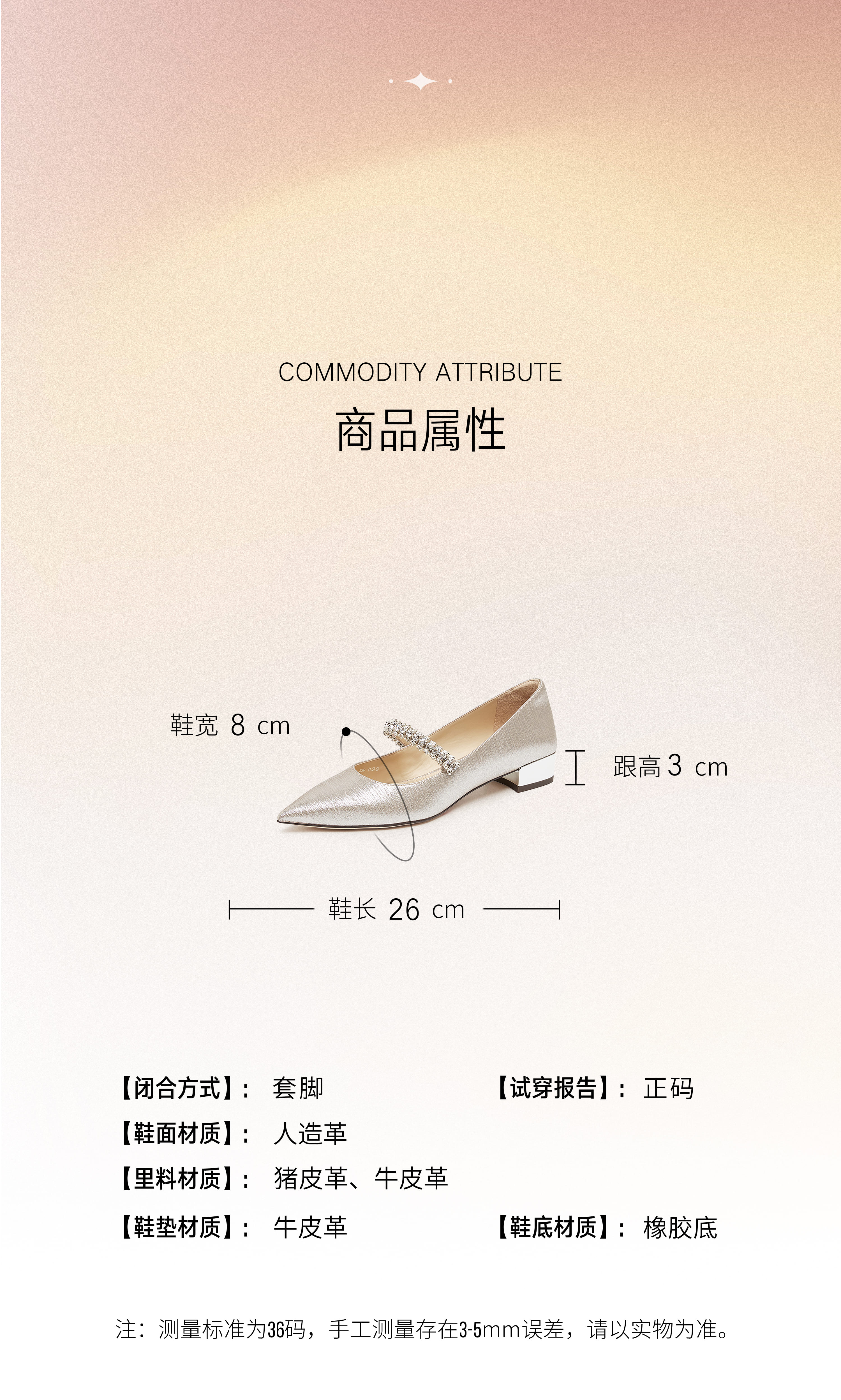 | 鞋面材质:人造革 | 流行元素:水钻 | 参考鞋长(女):26CM | 参考鞋宽(女):8.5CM | 闭合方式:套脚 |